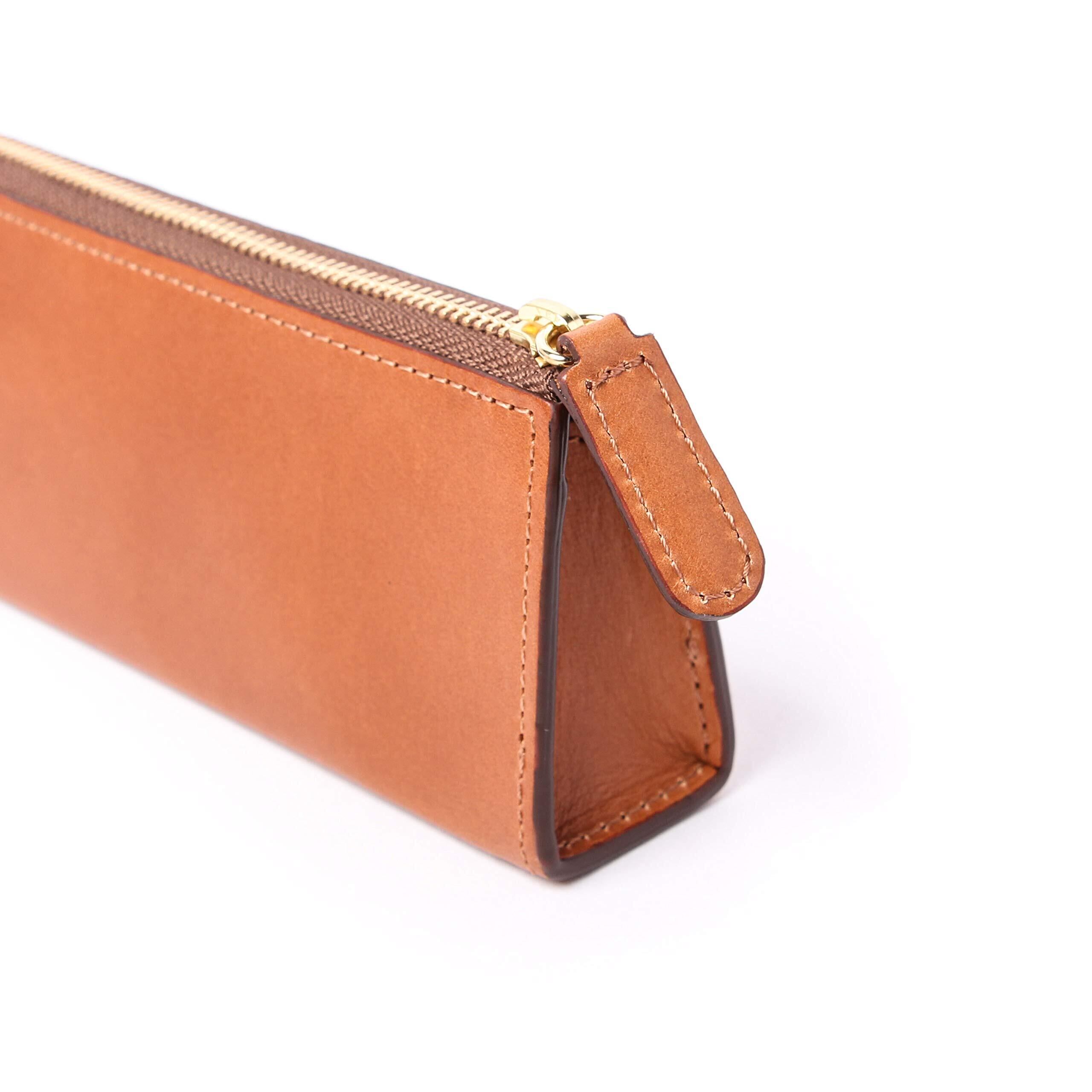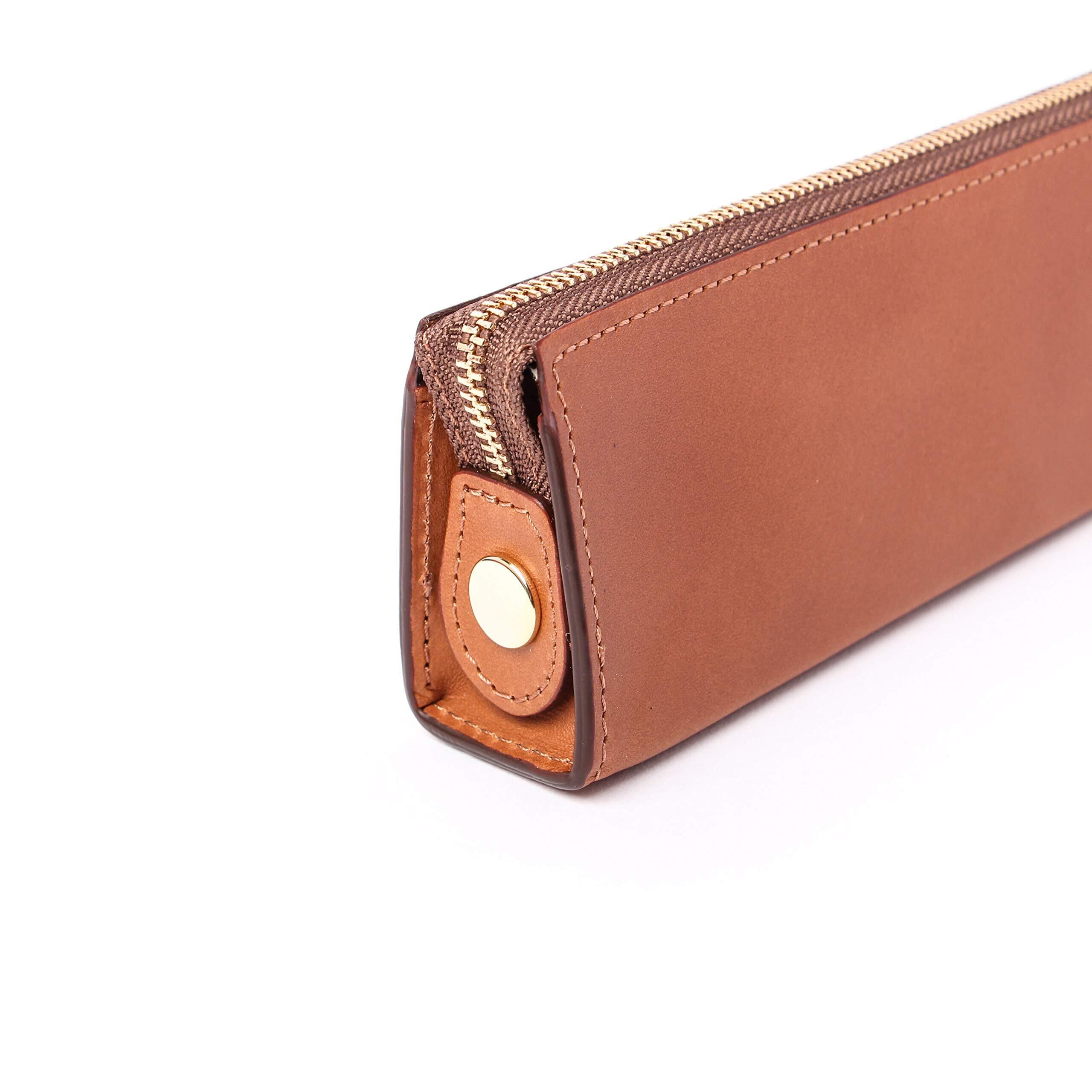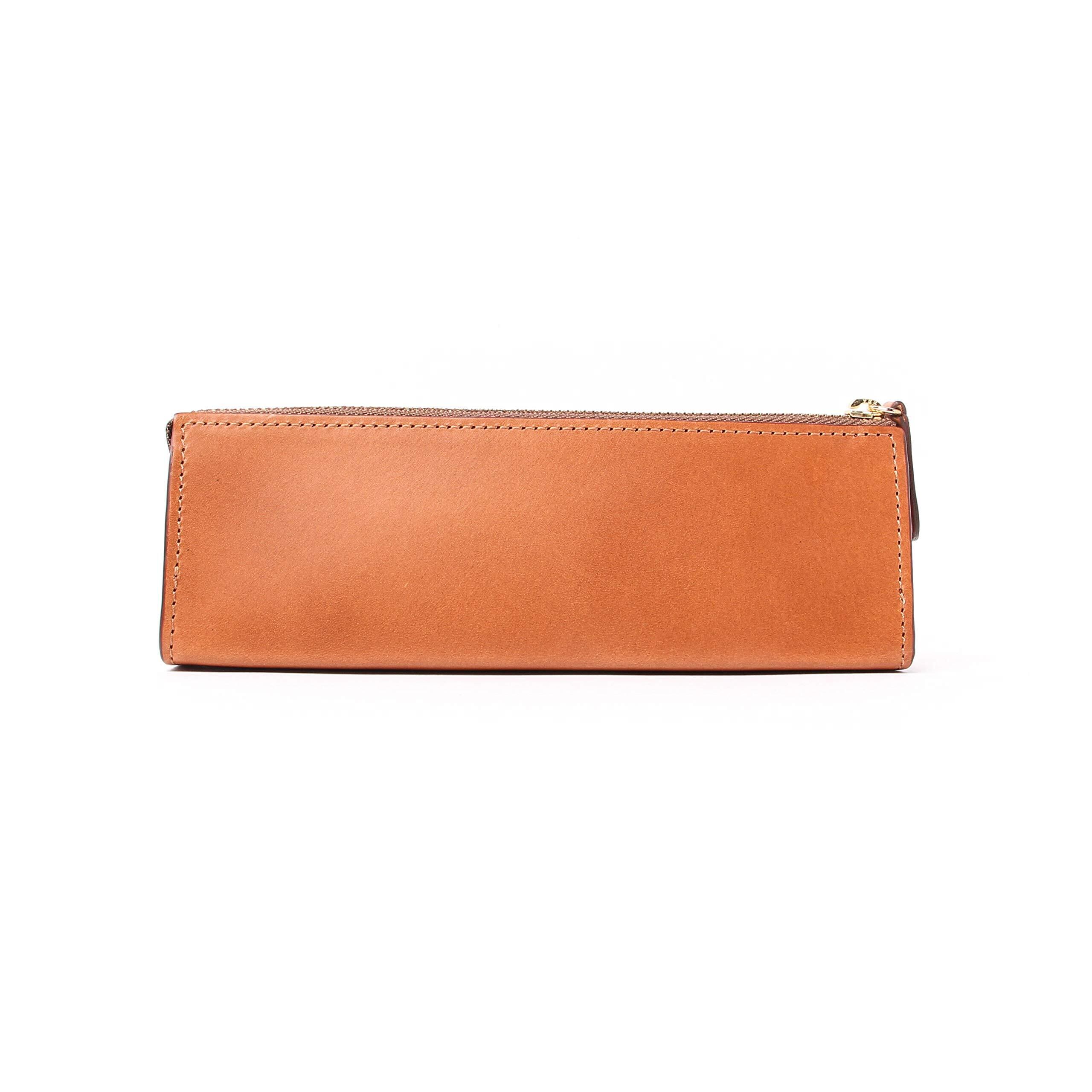 サイズ:長さ180 x 高さ60 x マチ巾35mm、重量:55g 素材:イタリアンオイルドレザー 仕上げ:端面コバ切れ目、磨き塗装仕上げ 内寸:長さ160mmのペンを底辺33mm高さ45mmの三角形に積み上げた容量がフォルムを崩しません。12~13本の筆記具を収納。