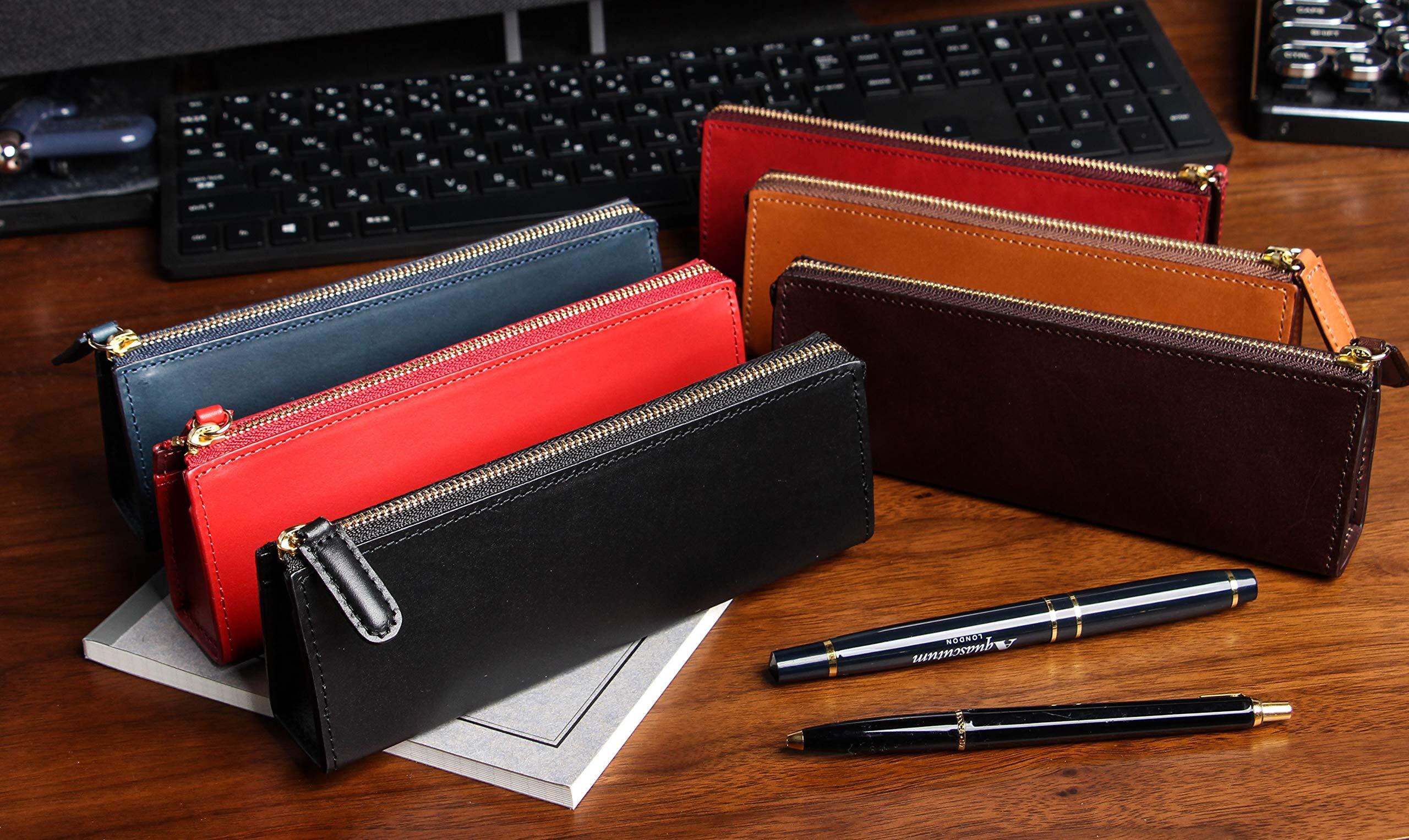 重量:55g、滑らかな革のスムースレザーを使用したファスナー付きのペンケースです。ペンが約12本収まり、大容量の収納力とシンプルな設計の為、高校生や大学生、社会人と様々な年代から高い支持を得ています。