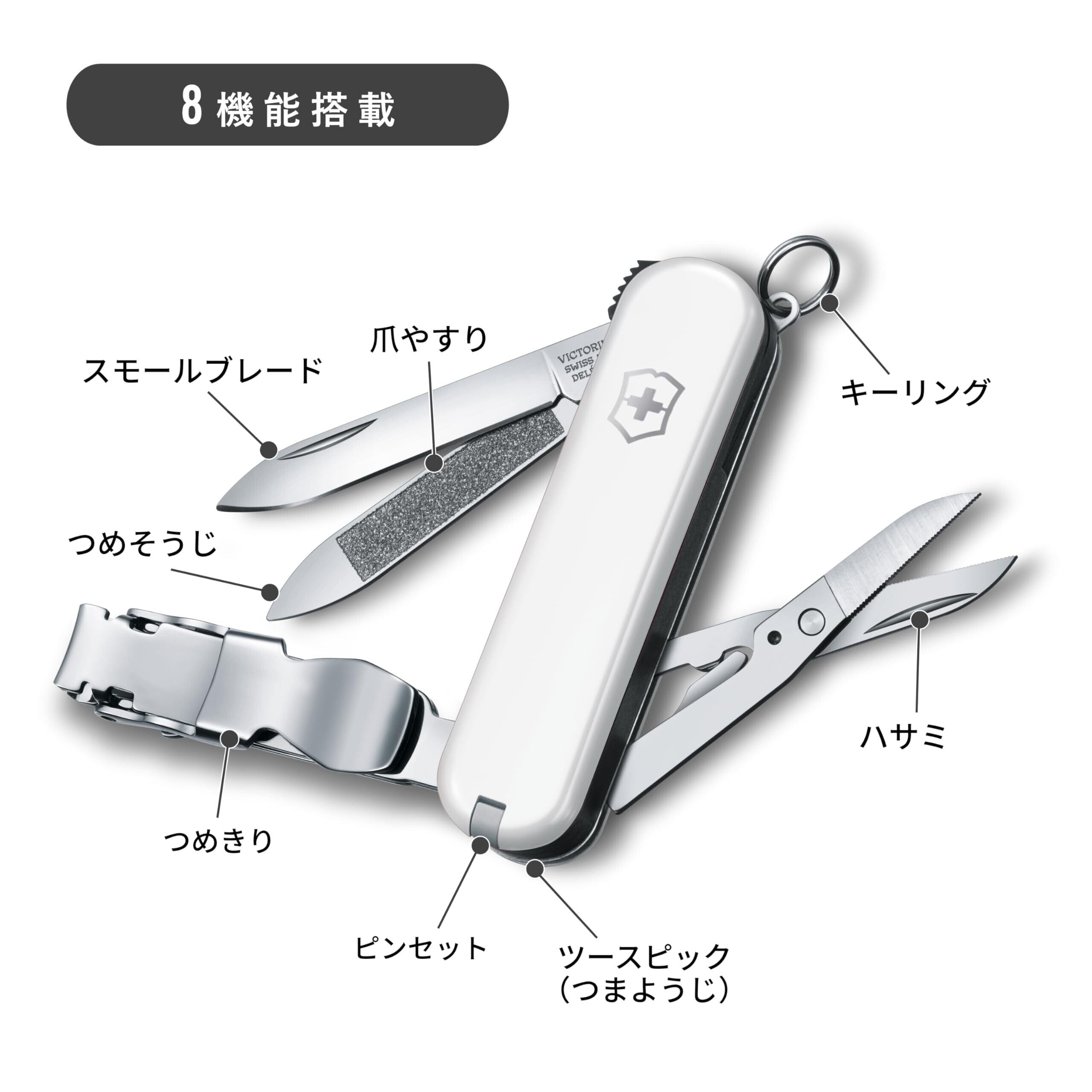 機能数8: つめ切り、ブレード( 刃体の長さ: 約4㎝ )、つめやすり、つめそうじ、はさみ、ピンセット、ツースピック、キーリング