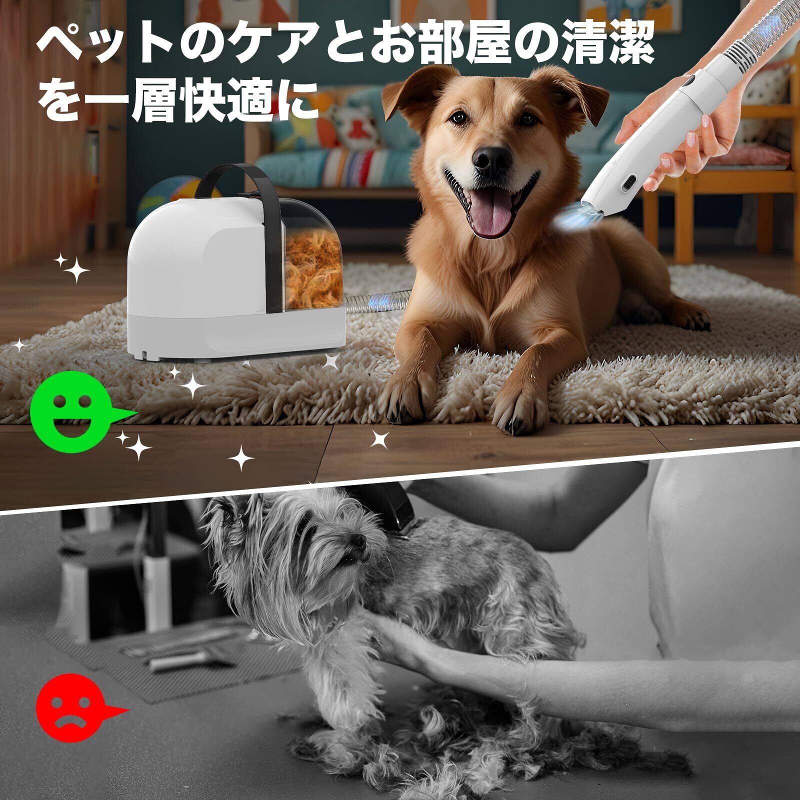 適用対象:ご家庭でもトリミングサロンでもご活用頂けます!中長毛犬、中長毛猫など、小中大型犬猫通用のグルーミング掃除機です。ソファー、カーペット、服の毛、マッサージ、抜け毛取りなど、様々なシーンで大活躍しています。ペットトリミングセットがあれば愛するペットの容姿が常に完璧に