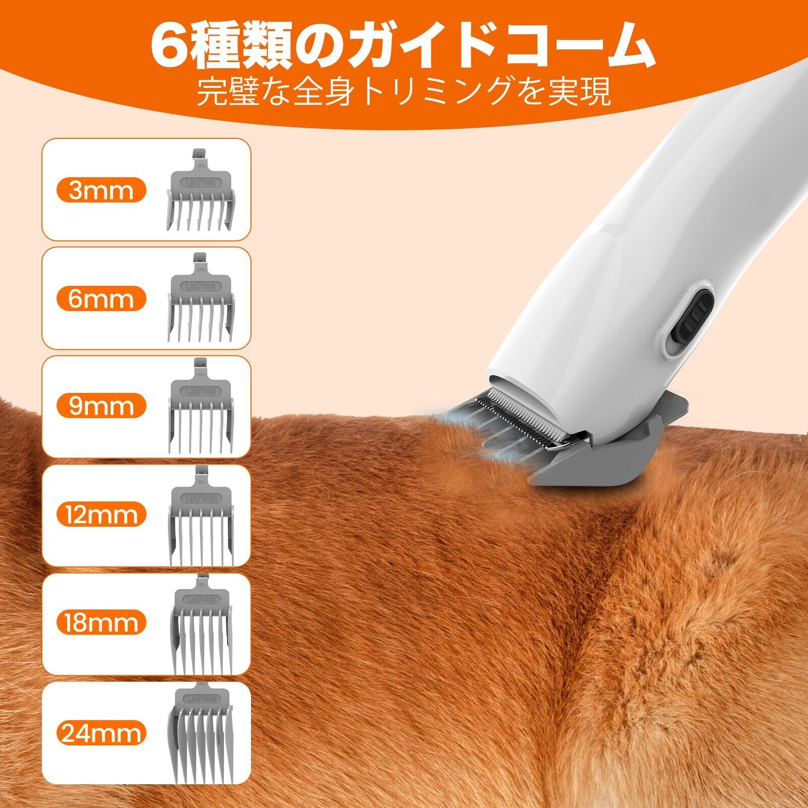 99%の抜け毛を吸い込む:犬 バリカン部品は、トリミングする同時に一気に剃った毛をダストカップに吸引し、掃除する必要がないです。全身カット用ブレードと細部ブレードとガイド櫛が付いており、必要によってスムーズな作業ができます。グルーミングブラシとすきブラシはブラッシングする同時にワンタッチで抜け毛を99%吸い込みます。他に掃除機用ブラシと吸い込みツールまであって家と服の掃除までできます