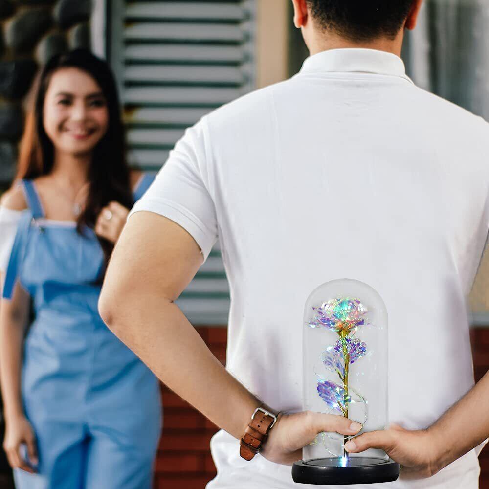【高品質のLEDストリングライト】エターナルローズはLEDストリングライトで包まれています。LEDストリングライトは輝度が高く、発熱量が少ないので、より安全に使用することができます。カラフルなLEDストリングライトには15個の電球が付いており、スイッチを入れると自動的に点滅します。暖色のLEDストリングライトには20個の電球が付いており、ライトの色はウォームホワイトで、スイッチを入れると常時点灯します。底部のスイッチをオンにすると、温かみのある白い光がガラスドーム全体を照らし、ロマンチックで居心地のよい雰囲気が生み出されます。注: LED ライトは手動でオン/オフする必要があり、自動的にオフにすることはできません。