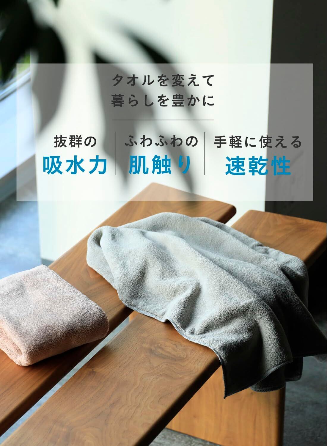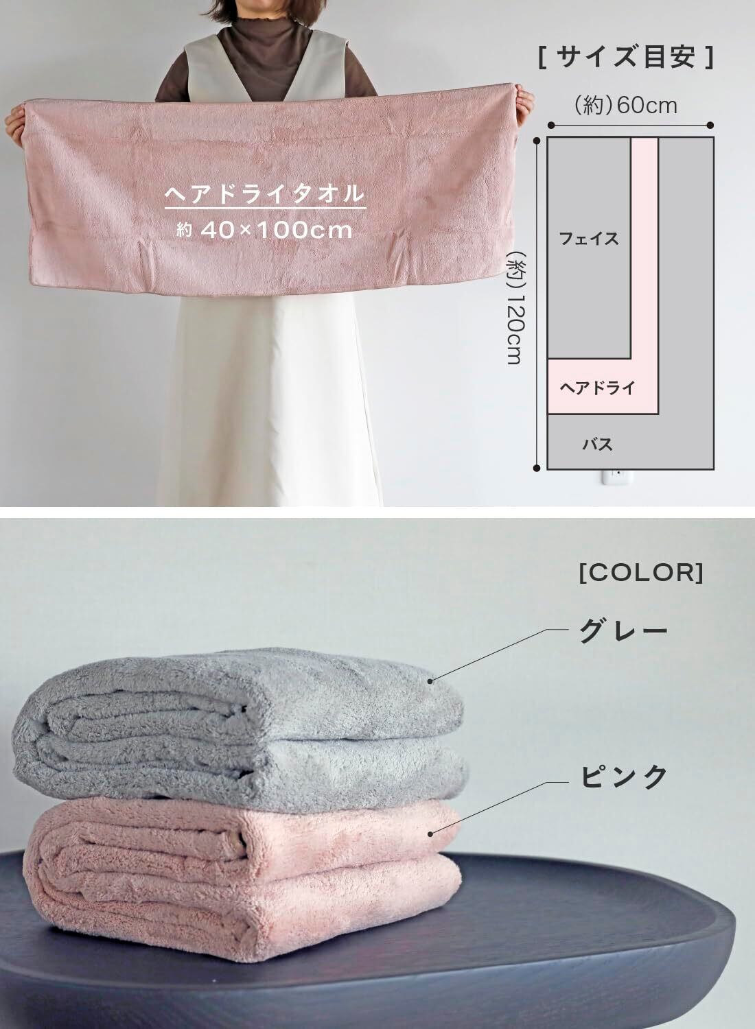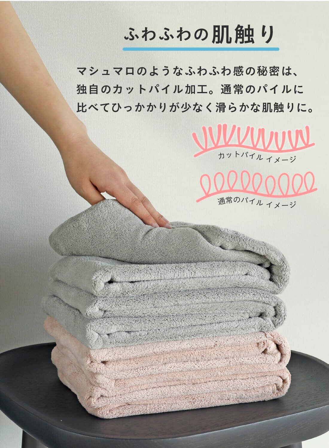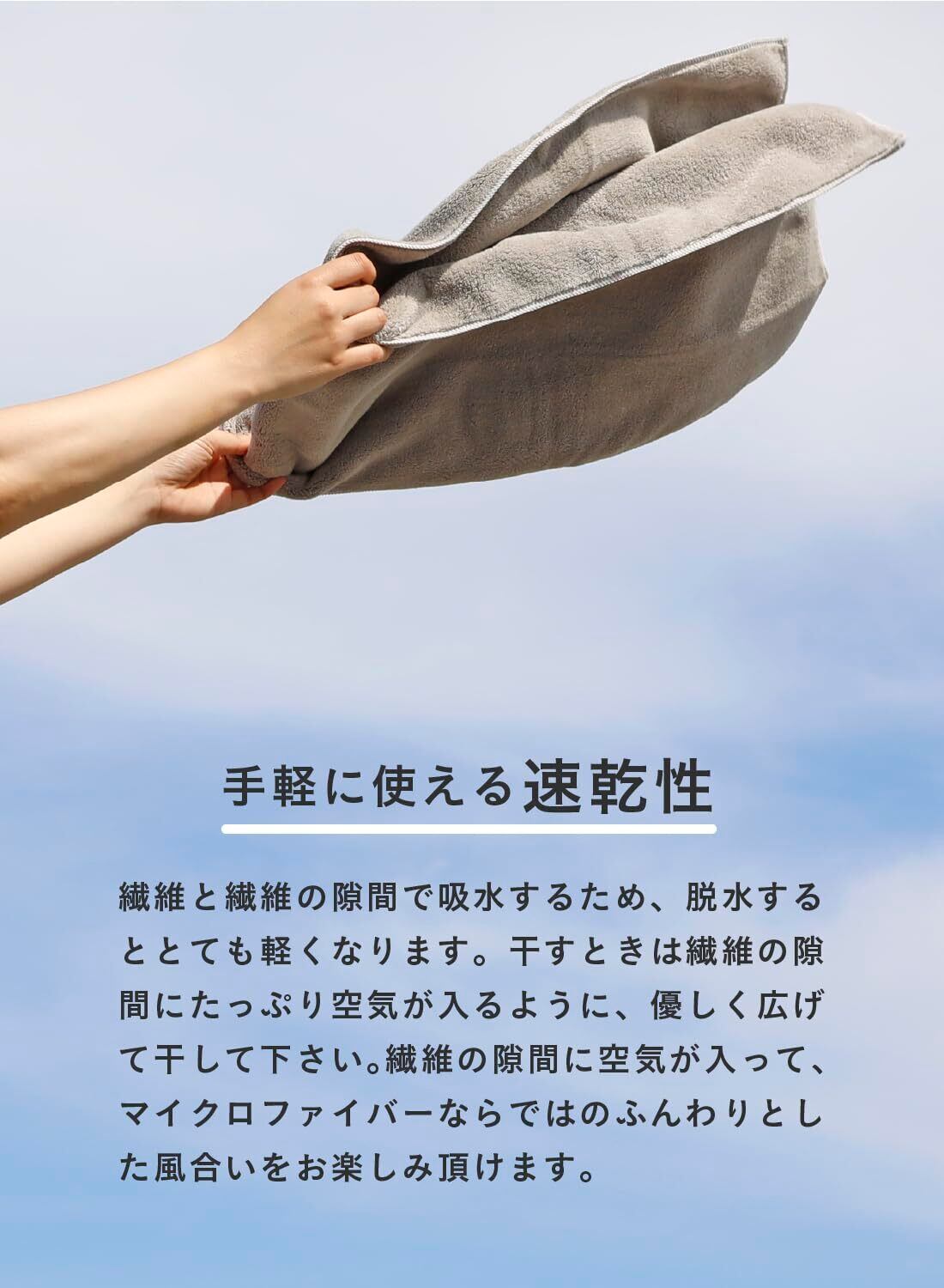 濡れた髪に軽く押し当てるだけで水分を吸収してくれるので、摩擦を減らしてダメージの軽減にも繋がります。ロングヘアの方のヘアドライはもちろん小さめのバスタオルとしても使えます。