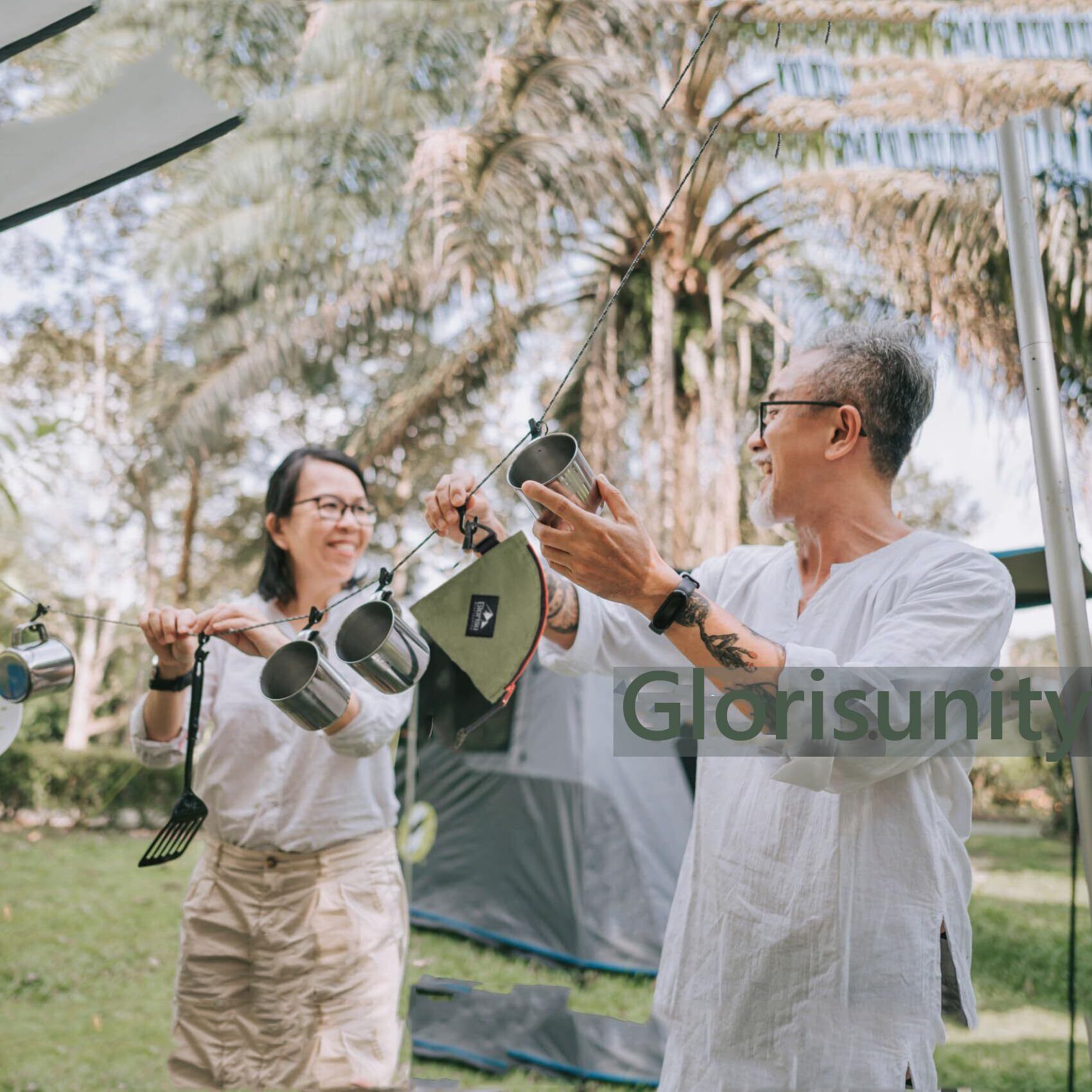 頑丈なカラビナで、アウトドア時カバンに掛けたり、枝、ランタンスタンドなどに掛けてもケースの開け閉めに影響しません。家で使ったら壁付フックに掛けても問題ありません。