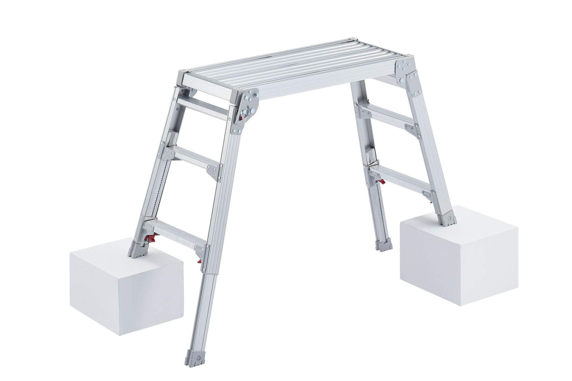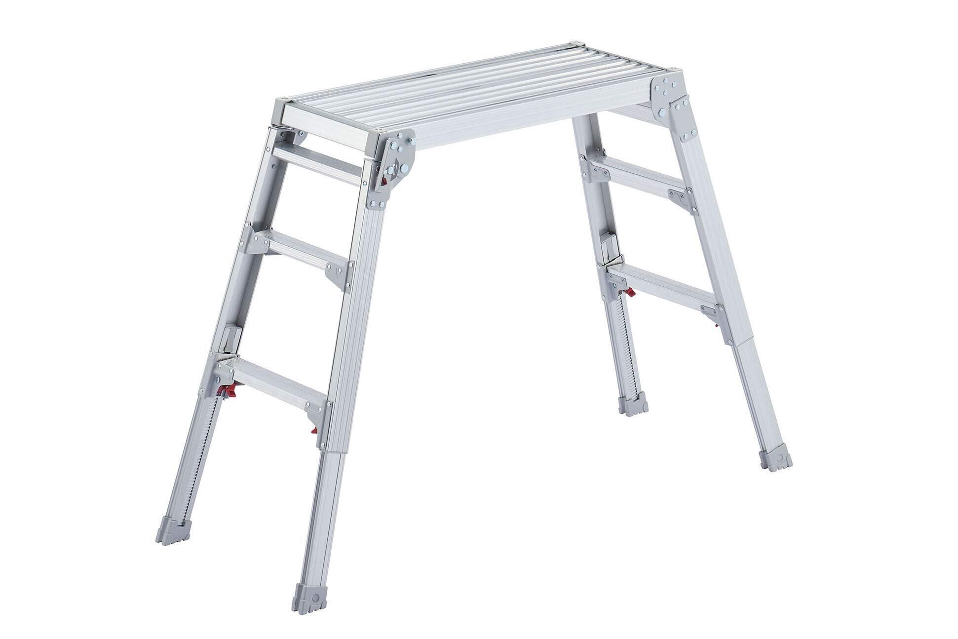 段差で使える脚部伸縮式足場台のスタンダード。段差で威力を発揮するロングストロークの伸縮脚。ワンタッチで操作でき、簡単です。