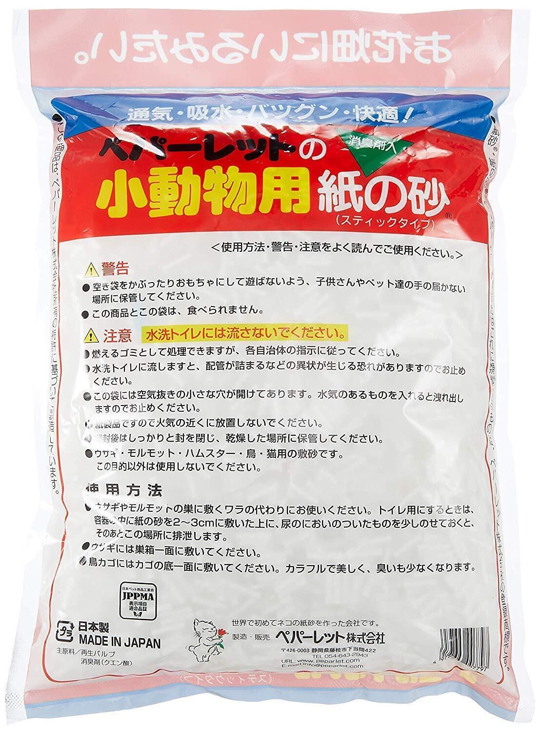 再生パルプ使用の「スティックタイプ」の紙の砂です。スティック状なので飛び散りにくいタイプです。小動物の敷きワラ、巣作りに最適です。