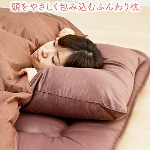 素材/[掛布団] 側生地:綿100%、詰物:フェザー100%/[敷布団]側生地:ポリエステル100%(ピーチスキン加工)、詰物:ウレタン(厚さ2cm)、巻綿/[枕] 側生地:ポリエステル100%(ピーチスキン加工)、詰物:ポリエステル100%/