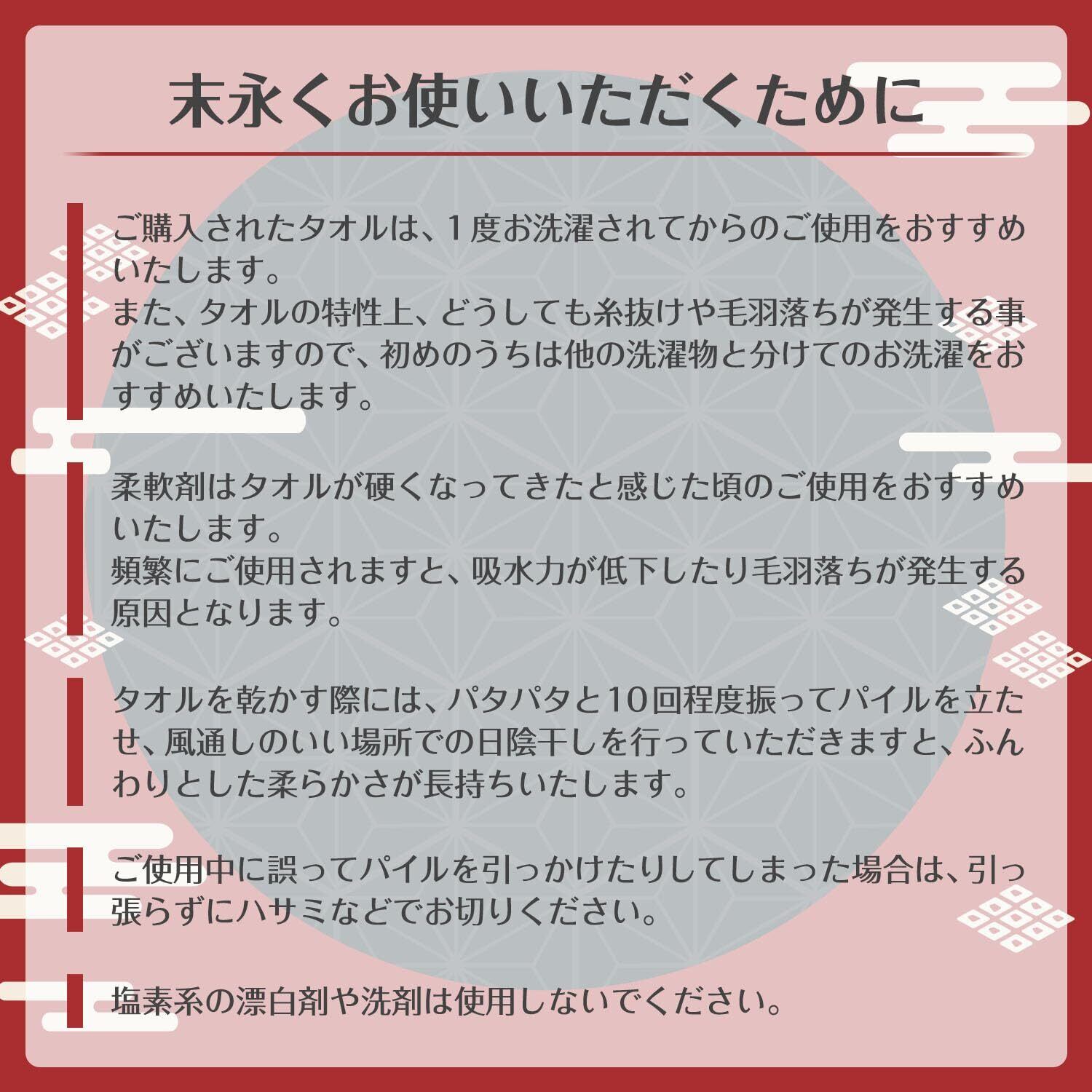 【ご使用の際のお願い】■綿製品の特性上、毛羽落ちがございます。■一度お洗濯してからのご使用をおすすめいたします。■柔軟剤の過度な使用は毛羽落ちや吸水性の低下につながりますので、タオルが硬くなってきたと感じた頃のご使用をおすすめいたします。■塩素系漂白剤や塩素系洗剤のご使用は色落ちや変色してしまいますのでお控えください。