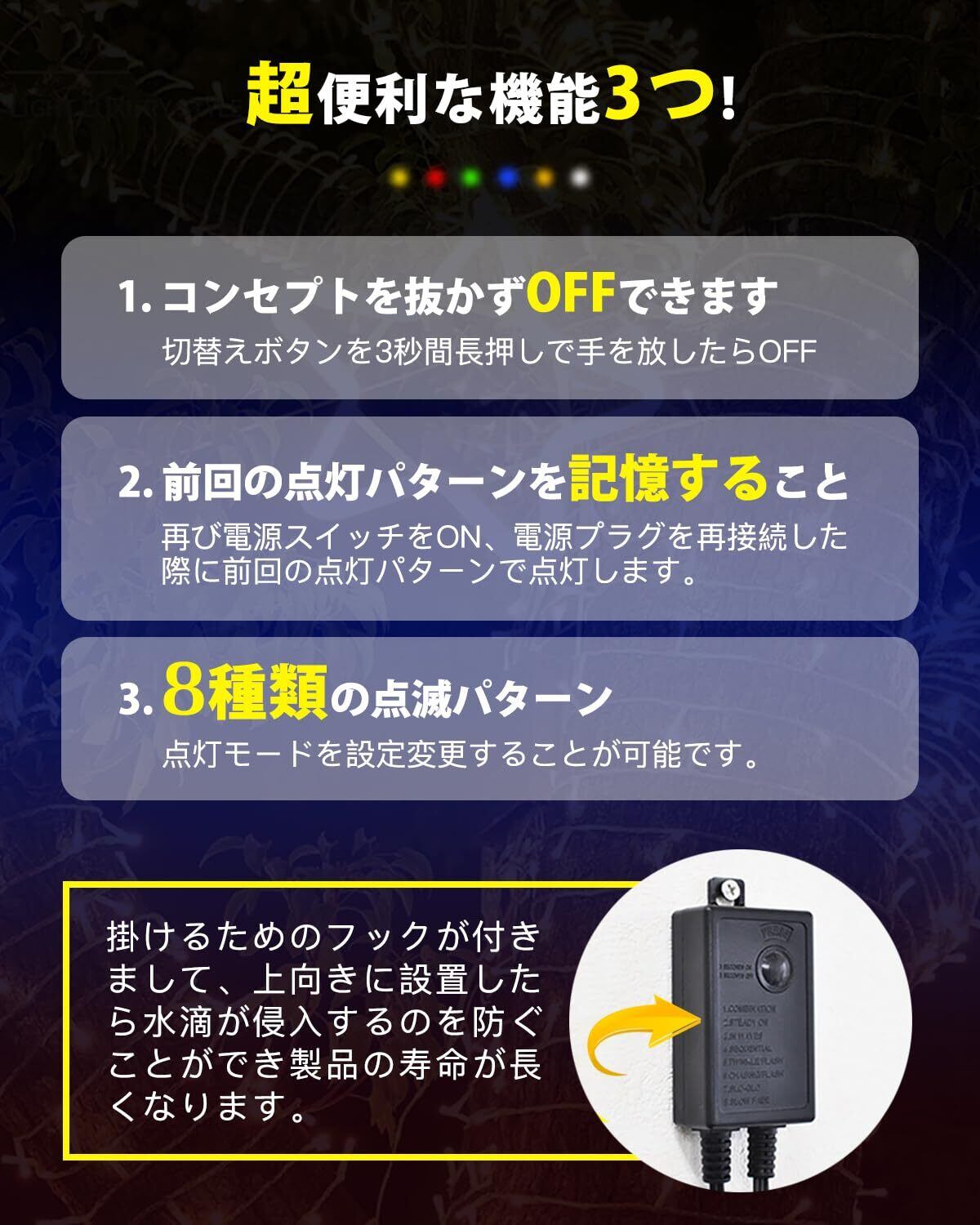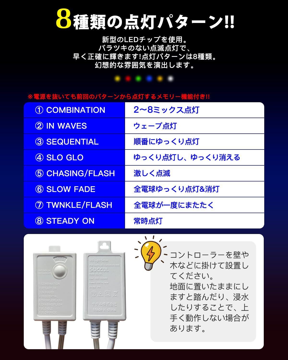 点灯パターンの8種類コントローラーは防水加工で室内屋外兼用!記憶機能付き。