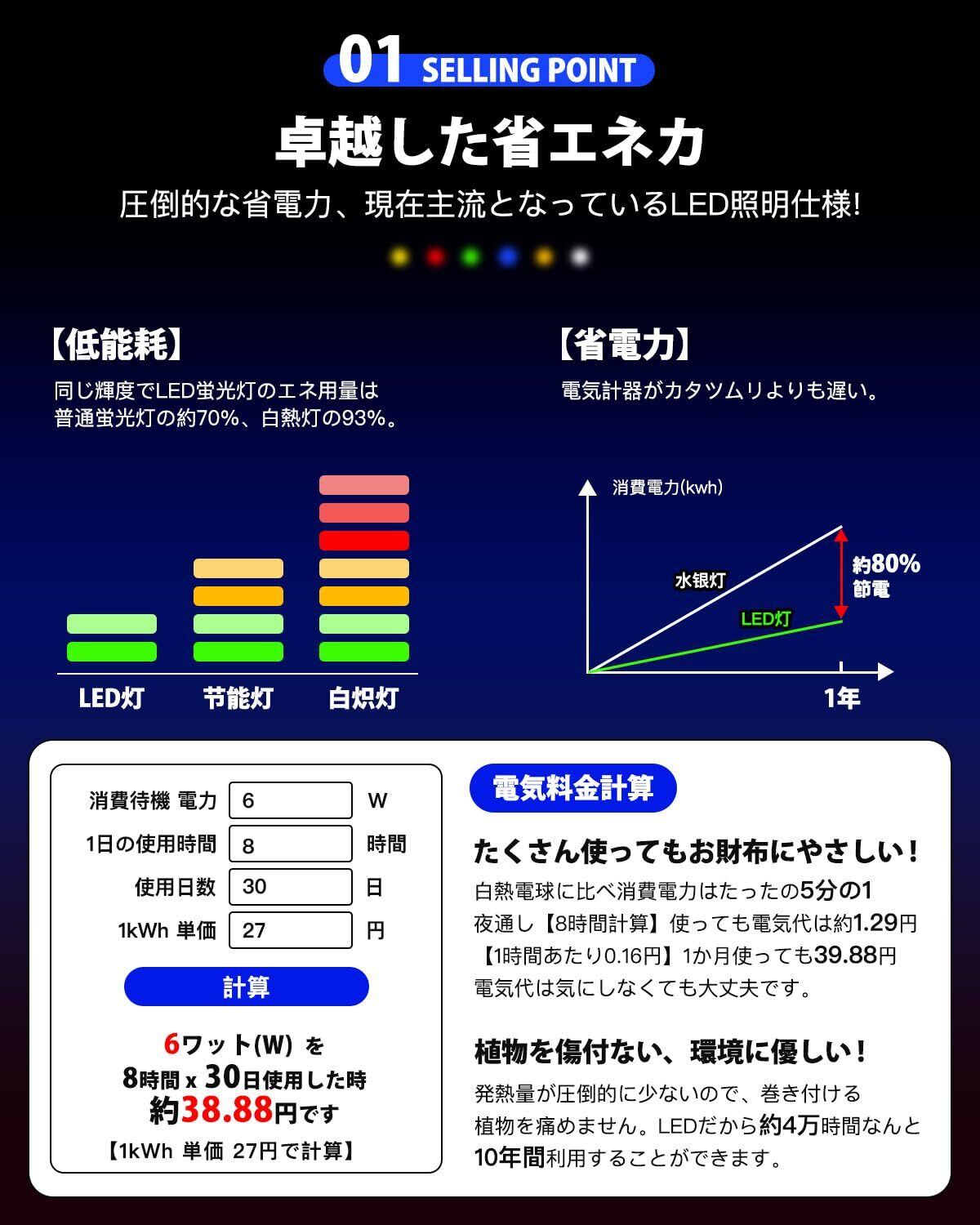 【製品仕様】高輝度拡散型LEDチップ120球、コントローラー長さ:約1.5m、重量(約):700g、防水等級 :IP44(生活防水)ブラックコード、
