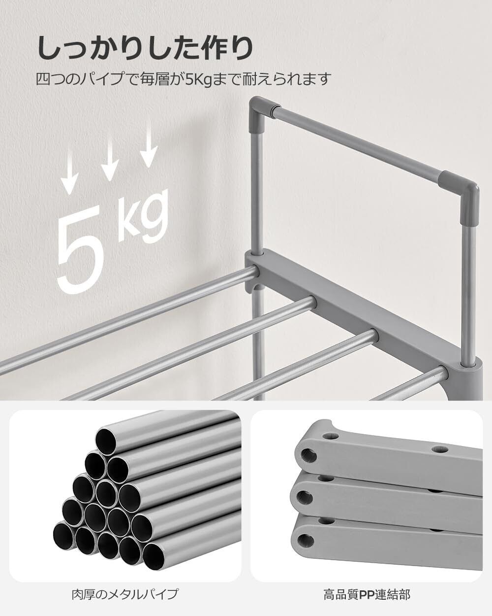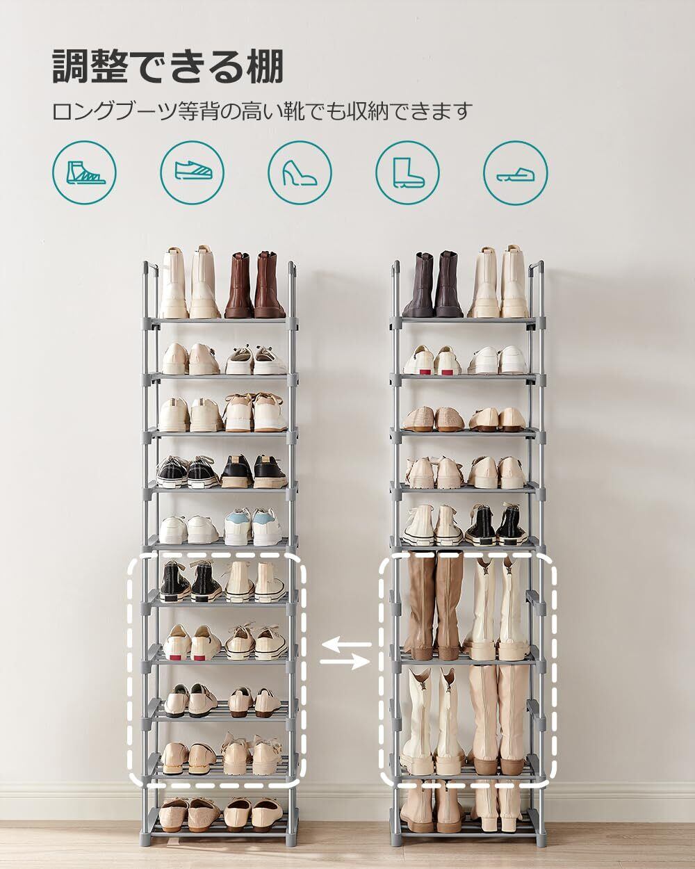【棚数を自由に調節可能】棚数を減らせばロングブーツも収納可能です。お持ちの靴に合わせて自由にカスタマイズできます