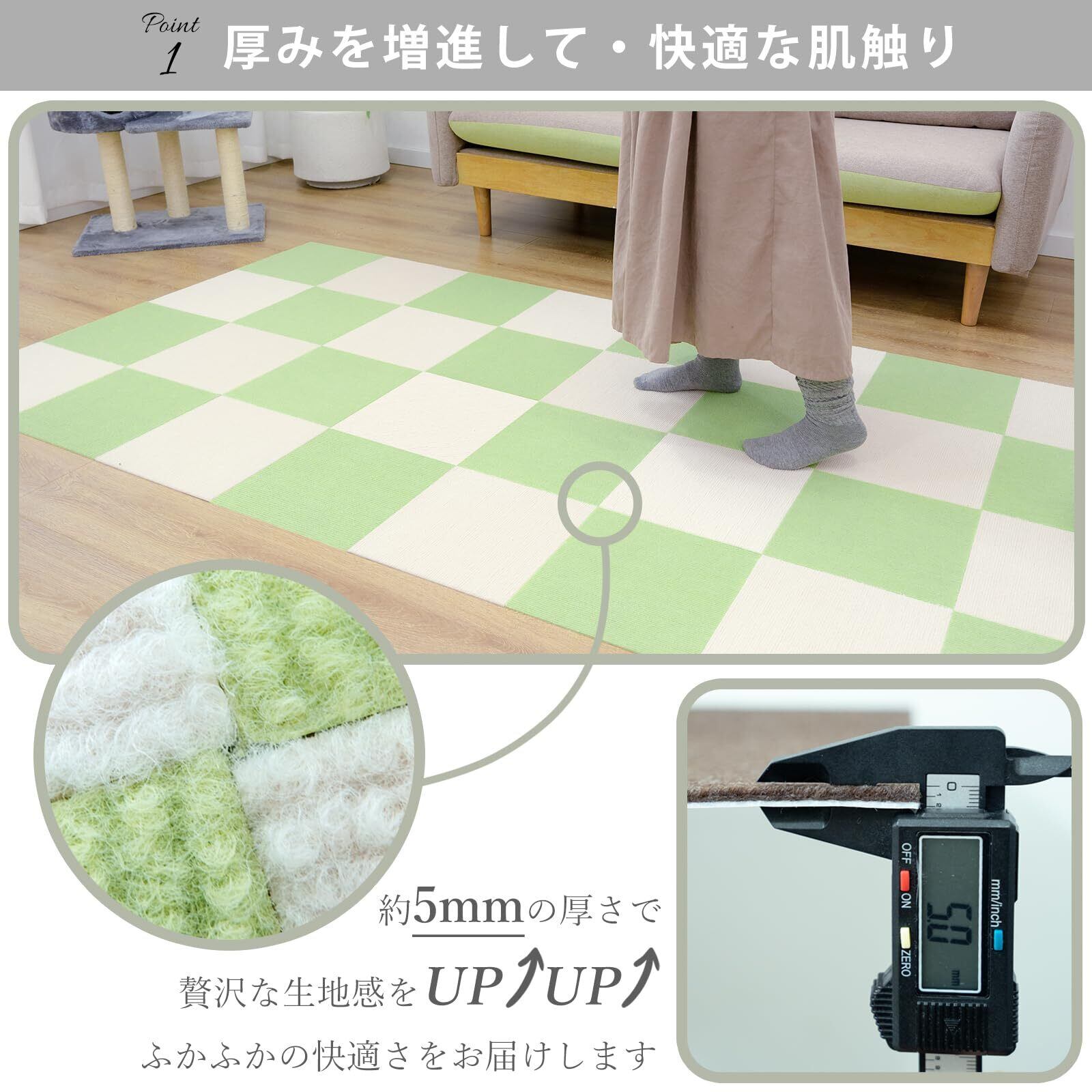 【厚さ5mmでフワフワ感】 You&ours タイルカーペット 30x30は、業界標準を超える5mmの厚さで設計されており、他の製品と比べて優れたクッション性を提供します。フワフワとした感触で、足元に優しく、心地良い踏み心地を実現。柔らかい素材で作られており、足元に優しい触感を提供します。腰に優しく、衝撃を吸収するため、ペットや高齢者にも安心です。お部屋に高級感と快適さをプラスします