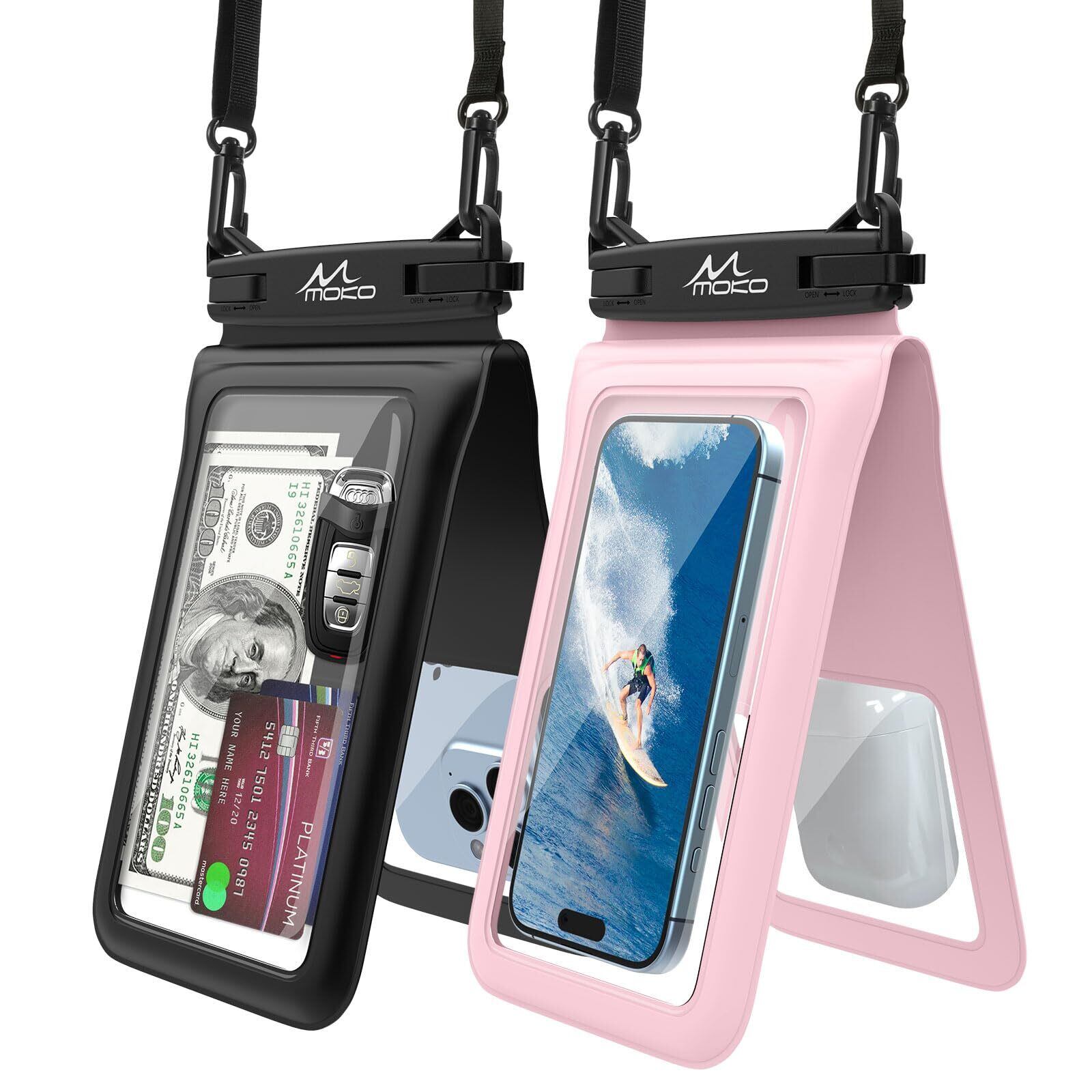 MoKo スマホ防水ケース 2個セット タブル収納ケース IP68完全防水 ビニール製 2台スマホ/クレジットカード/現金/鍵など共に収納対応 iPhone16 Pro Max/15/14/13/Galaxy S23 Ultra/S22/S21 Ultraなど6.7インチ以下のスマホに対応 タッチパネル操作可 首掛けストラップ付 浴室/お風呂/プール 海水浴 Black&Pink