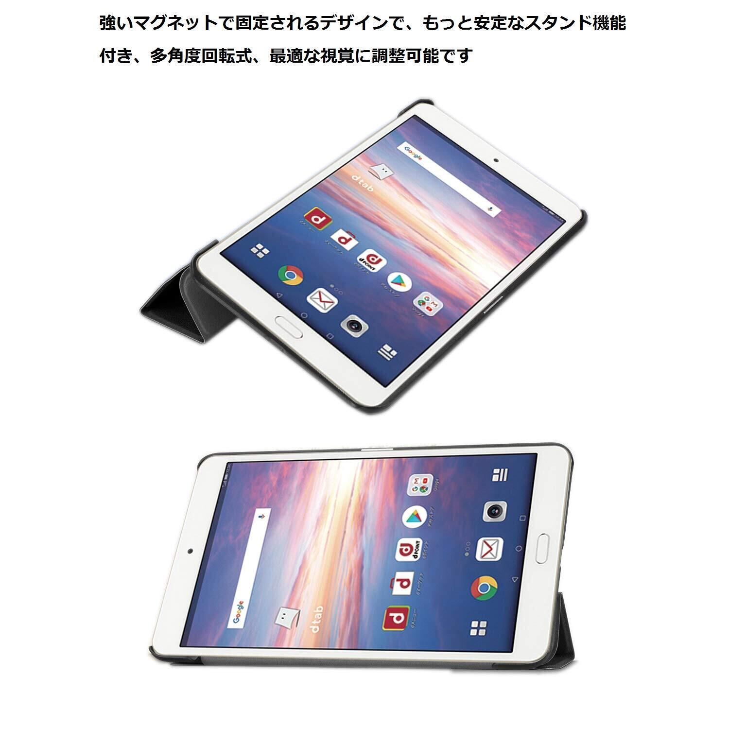 強いマグネットで固定されるデザインで、もっと安定なスタンド機能付き、多角度回転式、最適な視覚に調整可能です。フロントカバーと、バックカバーが、dtab Compact d-02K全体を保護します。バックカバーは傷や指紋からdtab Compact d-02Kを守ります。