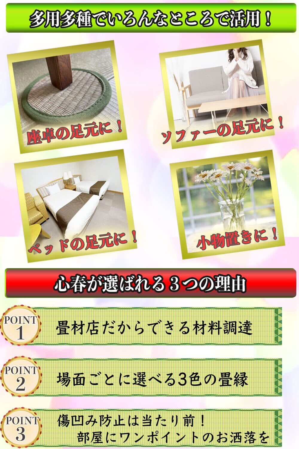 【備考】 抗カビ加工 ご自宅の座卓・テーブル・ベッド・ソファなどの下に敷くだけで、畳のへこみや床のキズを防止します。座卓敷きとしてだけではなく、花瓶敷きや小物置き、コースターなどとしてもお使いいただけます。 い草の織り目を互い違いに重ねた三層構造でしっかりしています。ゆとりのある直径約16cmだから大きめの脚でも安心・安全です。
