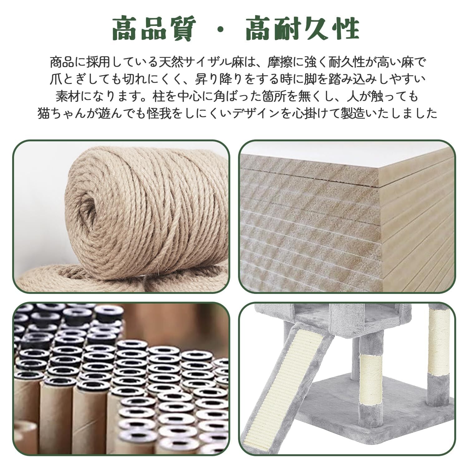 【優れた耐久性】猫 タワー表面全体は柔らかい手触りで小さい子猫も心地よく寝られます。キャットタワー モクセイ商品に採用している天然サイザル麻は、摩擦に強く耐久性が高い麻で、爪とぎしても切れにくく、昇り降りをする時に脚を踏み込みしやすい素材になります。キャット タワーの柱を中心に角ばった箇所を無くし、人が触っても、ねこちゃんが遊んでも怪我をしにくいデザインを心掛けて製造いたしました。