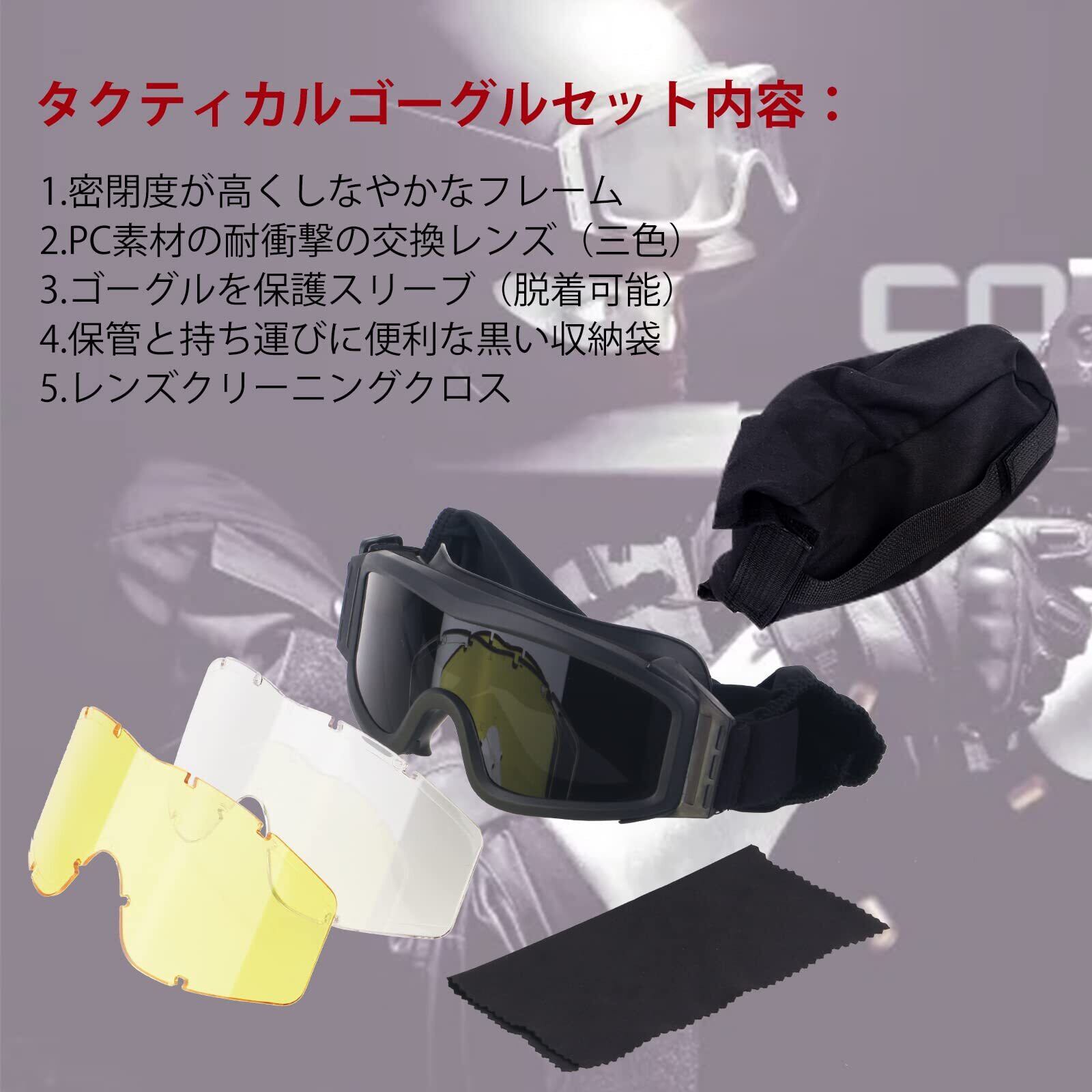 [FOCUHUNTER] タクティカルゴーグル スポーツメガネ 3色レンズセット ゴーグル レンズ交換簡単 長さ調節可能 耐衝撃 通気性 防風 防塵 サバゲー サングラス(Black) | BASE SHOP
