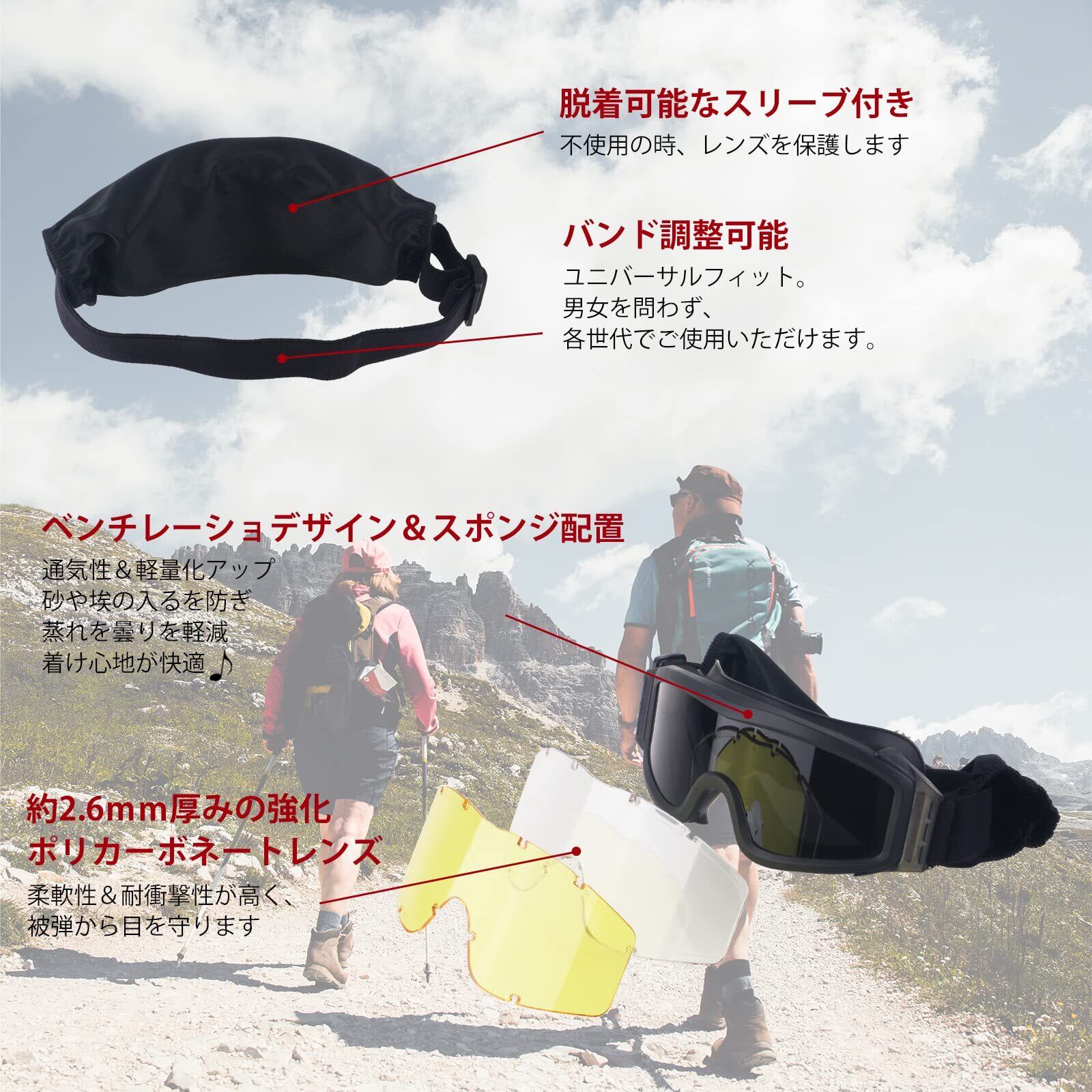 快適さ:高品質のポリカーボネート(PC)で作らており、、防曇性、防風性、耐衝撃性に優れています。3色交換レンズがあり、様々の環境に適します。ストラップを簡単に調整できます。通気スポンジ設計により、フィルター付きの換気を提供し、より高い曇り止め効果を発揮いたします。