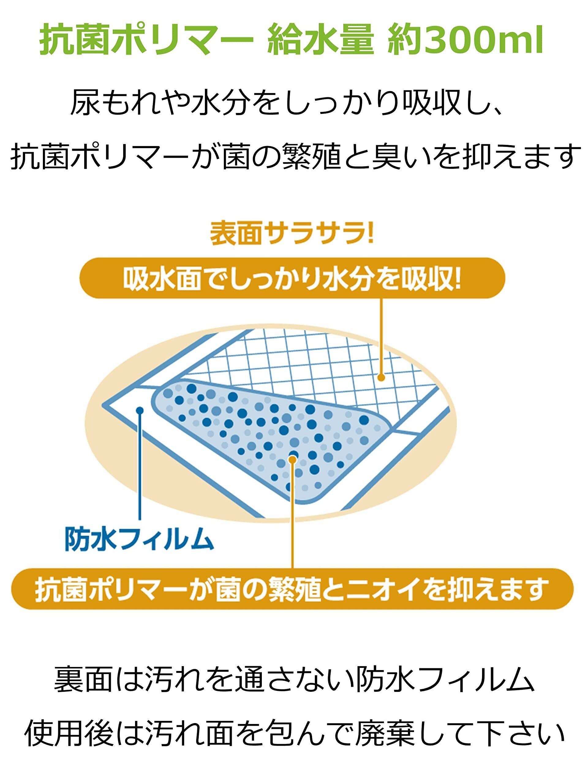 【 安心 】吸水量:おしっこ二回分約300ml(一回の排水量を150ccとして)。抗菌ポリマーが菌の増殖と臭いを抑えます。