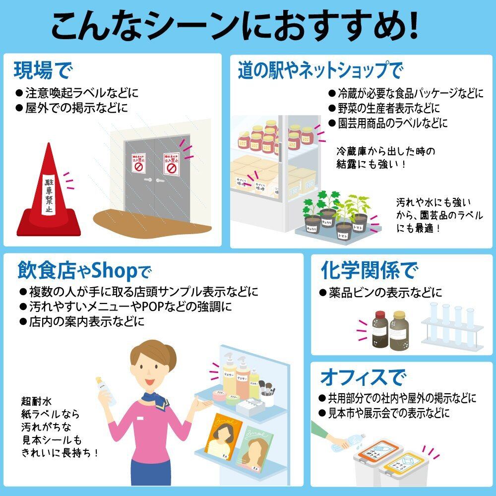 ●耐水・耐久性に優れており、屋内や屋外の表示にお使いいただける、カラーレーザープリンタ・カラーコピー用超耐水紙ラベルです。