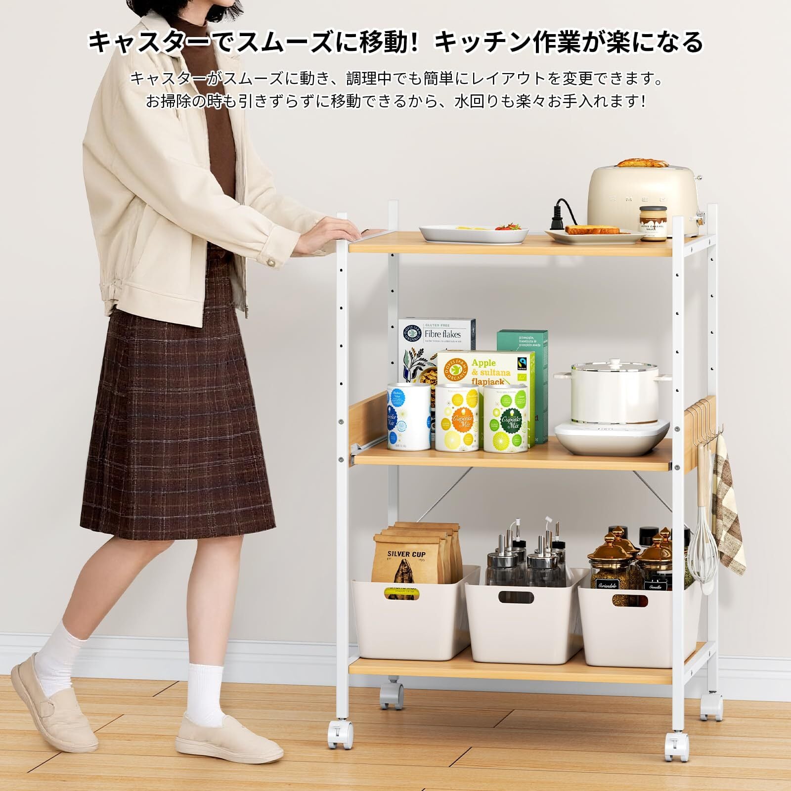 【便利なコンセントとキャスター付き】コンセント付きでミキサーや電気ケトルなどのキッチン家電をスマートに配置でき、コンセントを探す手間なく、調理や作業がスムーズに行えます。脚部にはキャスターが付いているため、お掃除の際やレイアウト変更の際も、ラックを簡単に移動できます。