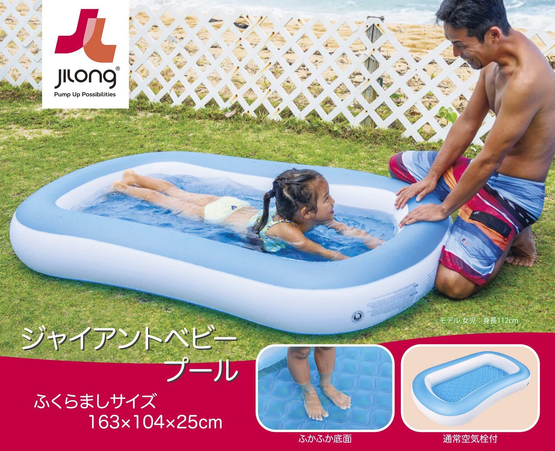 海外のインフレータブルブランド「JILONG」のプールです。 広めのベランダに最適な長方形のプールで底面にも空気が入るので クッション性が高くお子様の足やおしりにやさしい作りです。 膨らんだ状態のプールの大きさは長さ約163cm、横幅約104cm、高さ25cmです。 水の使用量の目安は約100Lです。 空気栓の数:2 対象年齢2歳以上 安全警告 禁止事項:とがったものとの接触、タバコや火気に近づけること 力任せの移動はビニール生地が破けたり穴が開いてしまう等、破損の原因になりますので絶対におやめください。 必ず先に設置場所を決めてから組み立て・設置をしてください。 安全警告 禁止事項:とがったものとの接触、タバコや火気に近づけること 力任せの移動はビニール生地が破けたり穴が開いてしまう等、破損の原因になりますので絶対におやめください。 必ず先に設置場所を決めてから組み立て・設置をしてください。