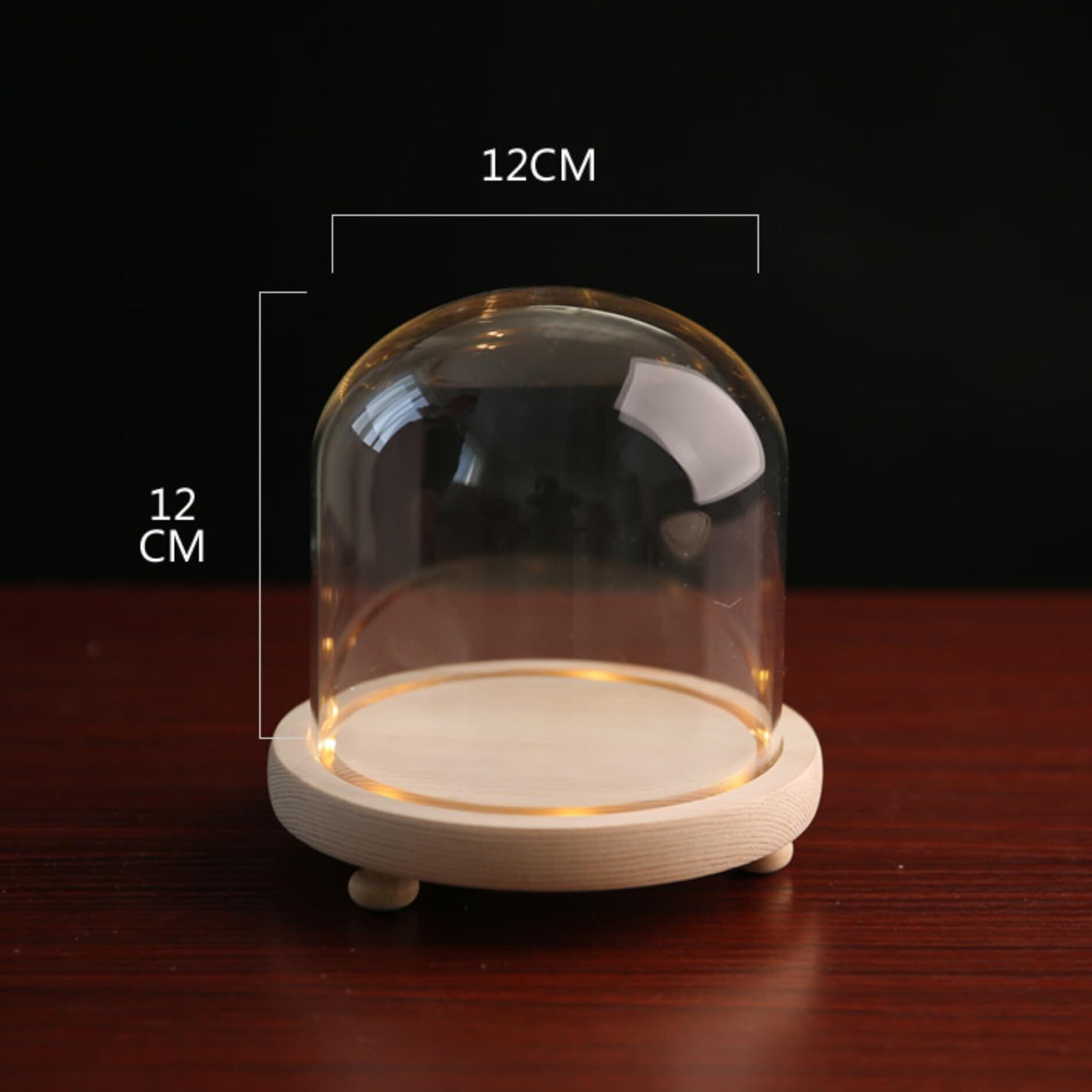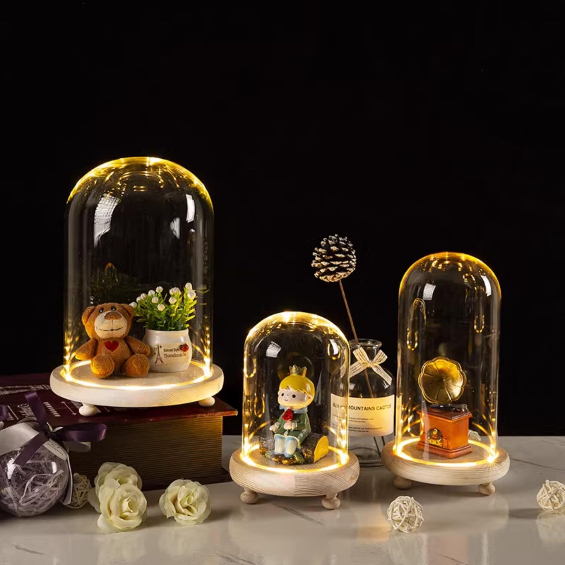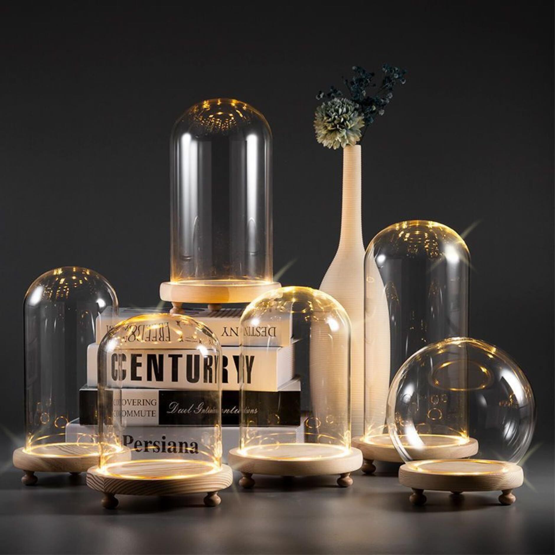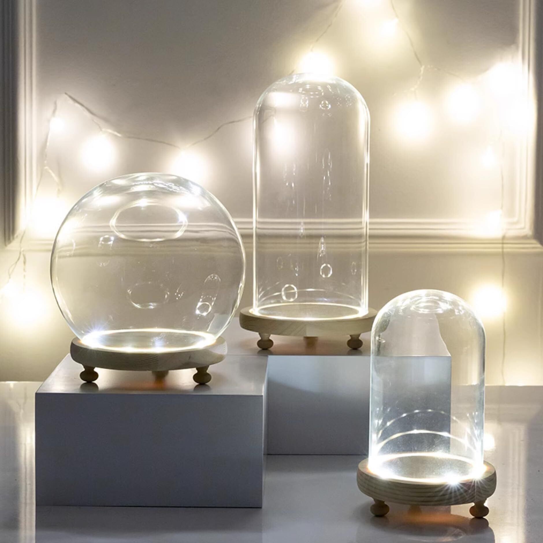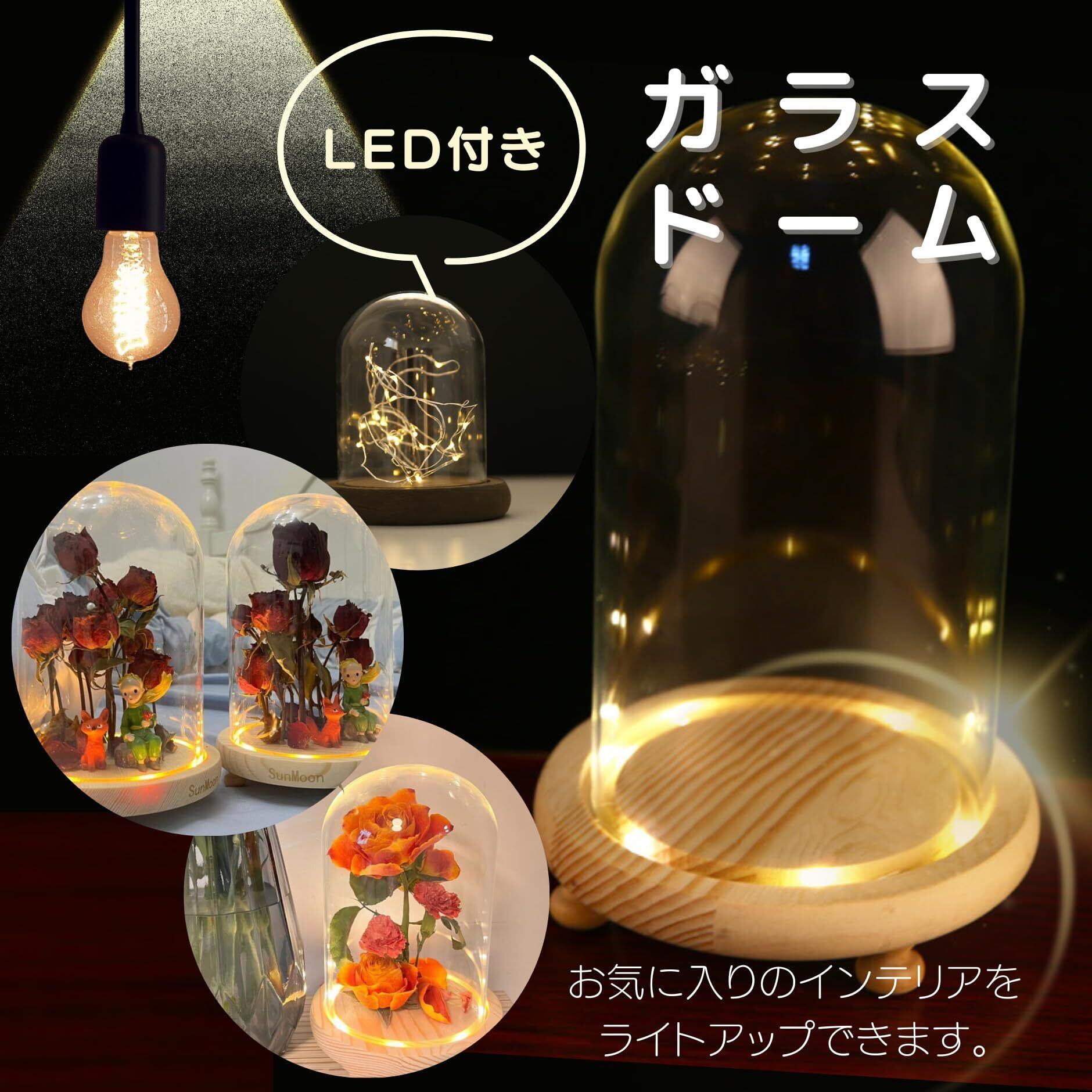 【LEDライト付ガラスドーム】インテリアに最適なおしゃれなデザイン。お気に入りのコレクションをドームに保管。夜はLEDを灯してライトアップ出来ます。ドーム内に保管することで、インテリアになりつつ、埃などからコレクションを守ります。