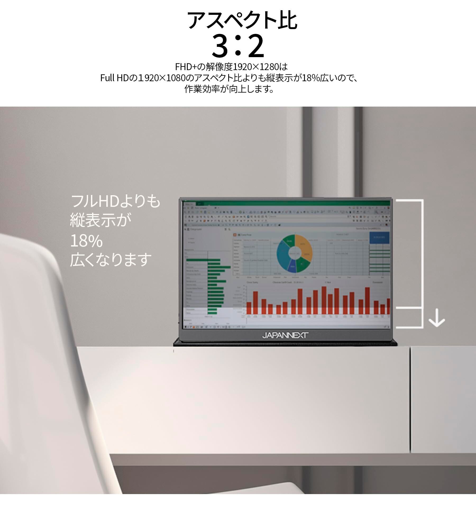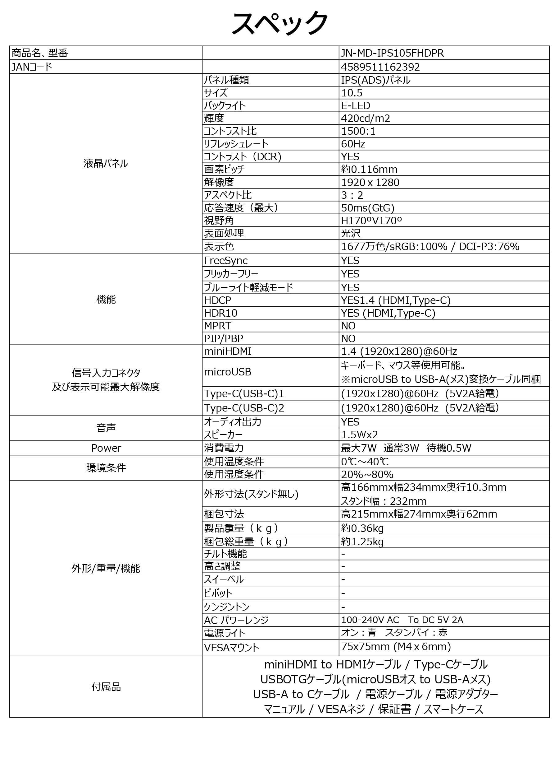 HDRに対応した10.5インチ フルHD+(1920x1280)解像度のモバイルモニターです。約360gの軽量で携帯性に優れ、外出時やテレワークなど場所を選ばすディスプレイを活用できます。フルHD+(1920x1280)解像度は、従来のフルHD(1920x1080)解像度より縦の解像度が18%大きいので、ニュースやブログなどのウェブサイトを一度に表示できるコンテンツ量が増えます。アスペクト比3:2に対応。上下左右170度に対応した広視野角IPSパネルを搭載。最大輝度420cd/m2の高輝度液晶はsRGB100%の広色域に対応し、コンテンツを色鮮やかに映し出します。また、HDR(ハイダイナミックレンジ)に対応。明るい部分も暗い部分もくっきり表現しリアルに迫った深みのある映像を演出します。 USB Type-Cケーブル1本で電力供給と映像表示が可能となっており、ケーブルまわりがスッキリします。インターフェイスはUSB Type-C x2とminiHDMI x1、さらにMicroUSB x1を搭載。パソコンだけでなく、様々な機器との接続が可能です。付属のUSB OTGケーブル(microUSB-USB-A変換ケーブル)経由でキーボード/マウスを接続することで、PCモード対応のスマートフォンなどを操作することが出来ます。 ブルーライト軽減モードを搭載し、フリッカーフリー設計で、目と身体への負担を軽減します。付属の折りたたみスマートケースは、マグネットタイプの着脱式となっており、折りたたむことでスタンドとして使用することができます。また1.5W x2のスピーカーを内蔵しています。