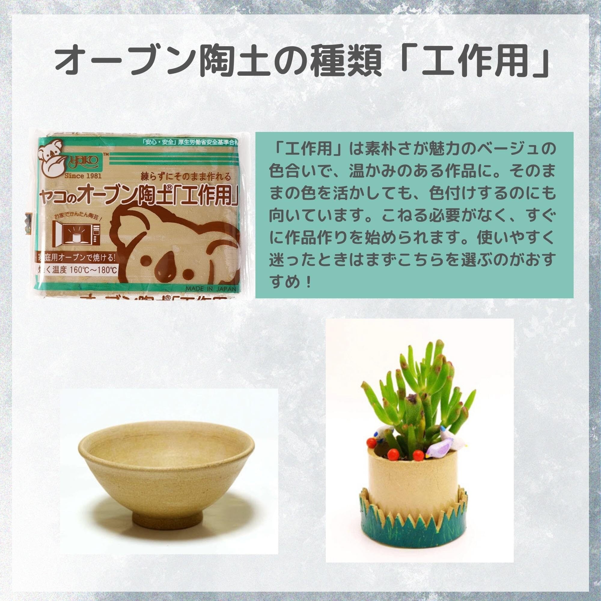 ヤコ(yako)のオーブン陶土の4色セットとなります。工作用、Milk(ミルク)、紅陶、黒木節の粘土が1個ずつ入っています。 「工作用」は素朴さが魅力のベージュの色合いで、温かみのある作品に。そのままの色を活かしても、色付けするのにも向いています。 「ミルク」は白いオーブン粘土で、発色が良く、色付けしたい作品に最適。何色でも綺麗に映えるので、作品に模様やイラストを描いて楽しむことができます。 「紅陶(べにとう)」は赤みがかった色が特徴のオーブン粘土。赤茶色のオーブン粘土は緑の植物と相性抜群で、ミニプランター作りなどに適しています。 「黒木節」は工作用オーブン陶土と性状は同一で、お互いにまぜて使用することができます。瀬戸産の黒木節粘土を使用しているため焼き上がりは濃茶になり、シックな仕上がりの作品が作れます。 4種類の粘土が入っていますので、様々な作品作りを楽しむことができます。