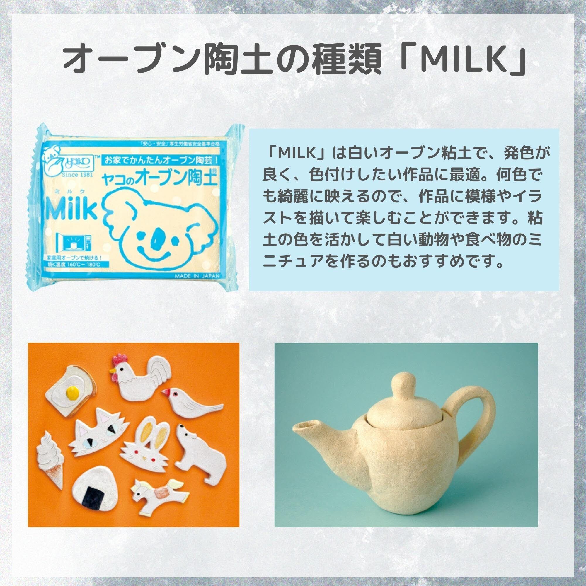 「ミルク」は白いオーブン粘土で、発色が良く、色付けしたい作品に最適。何色でも綺麗に映えるので、作品に模様やイラストを描いて楽しむことができます。