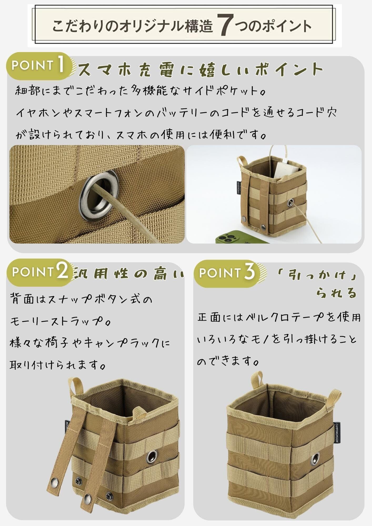 特徴:①フィールドラック、チェア、コットに取り付けることができる小物ケースです。単体で小物入れとしてもご使用いただけます。②側面にナイロンテープがついており、カラビナやアクセサリーを取り付けることができます。