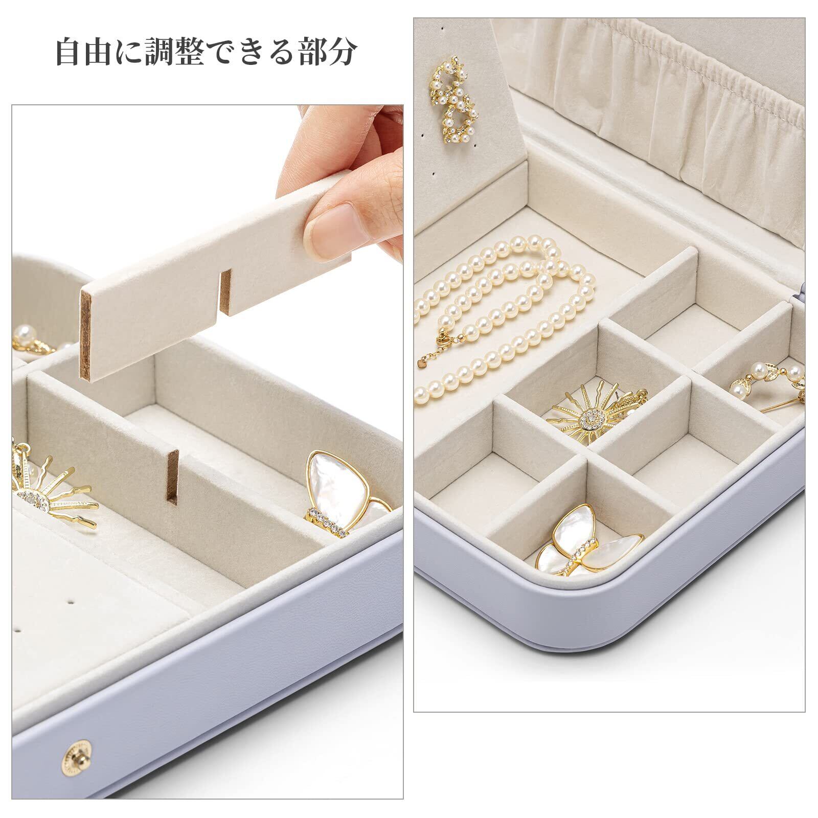 【収納力抜群】このジュエリーボックスは、軽量でコンパクトながらもたくさんのアクセサリーを収納できます。イヤリング、ブレスレット、ブレスレット、リング、ネックレス。ビデオだけでなく、仕切り板を調整することで口紅や腕時計などの日常のアイテムも収納できます。贅沢なジュエリーボックスで、大切なアクセサリーをしっかりと保管しましょう。