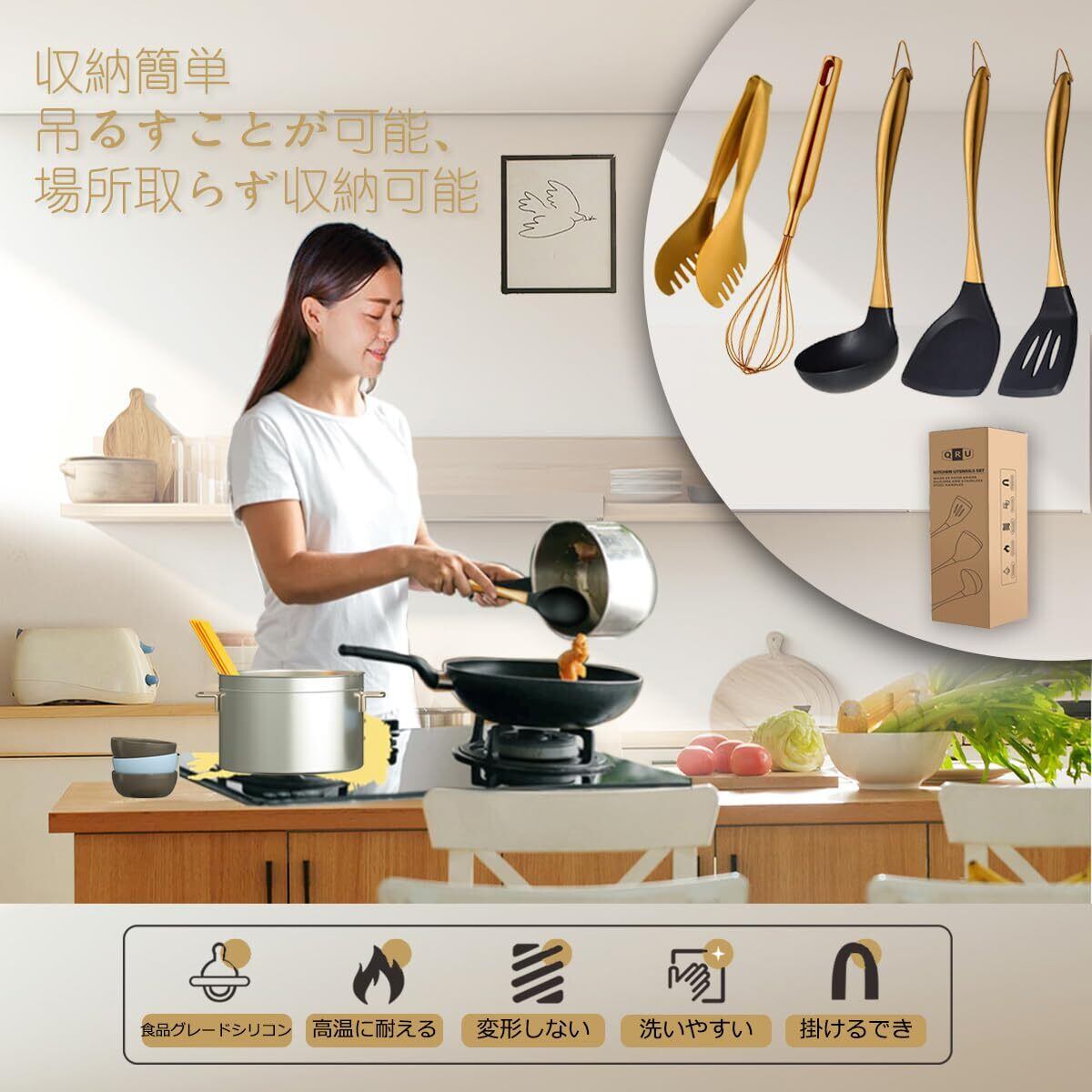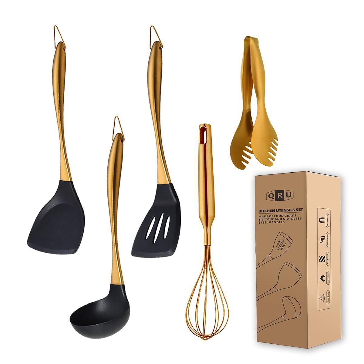 キッチンツールセット 5点セット シリコン製調理器具セット ステンレス製ハンドル 一人暮らし シリコン ターナー フライ返し お玉じゃくし 泡立て器 トング (ゴールド)
