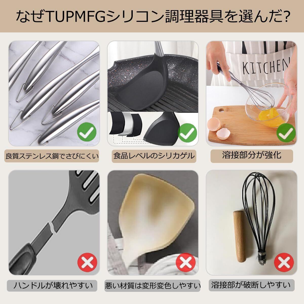 【調理厨具の品質】TUPMFGシリコン厨具は収納便利、变形しない、断裂しない、異味なし、高溫耐性、食洗機対応の特徴があり。TUPMFG製品に不具合が生じた場合、こちらは代替え品を交換すること可能です。万が一お届けの商品が不具合などございますたら、弊店にメールにて連絡するようお願い致します。