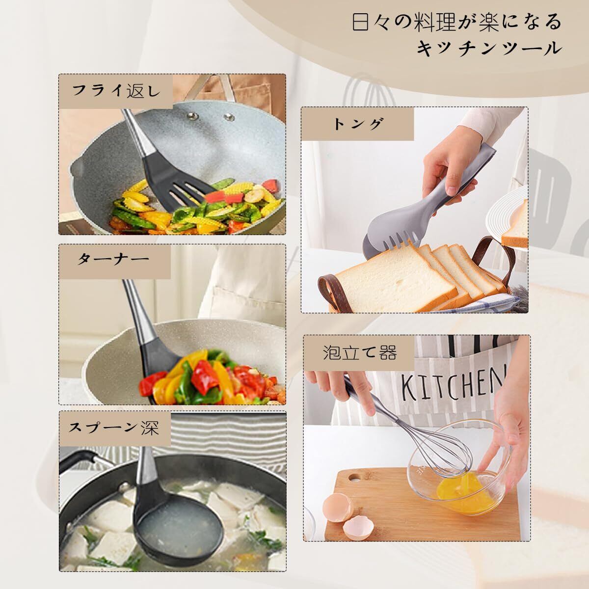 【统一感のある配色&キッチンツール5点セット】セット内容:ターナー、フライ返し、お玉じゃくし、泡立て器、トング、かわいい見た目、いつも綺麗に見えるキッチンを演出。、普段家事や仕事に疲れている主婦はもちろん、一人暮らし、新生活やお引越し祝い、クリスマスなどのプレゼントにもおすすめ。