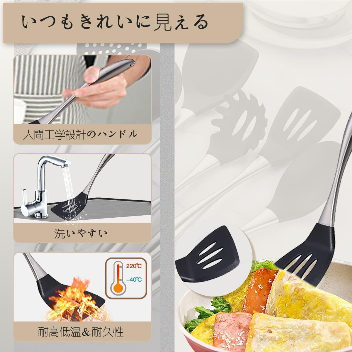 【食品グレードシリコンのヘッド】:有害物質なしのシリコン製を採用。鍋やフライパン、食器などを傷を付けません。耐熱温度は-40℃~220℃になります、耐久性が優れます。
