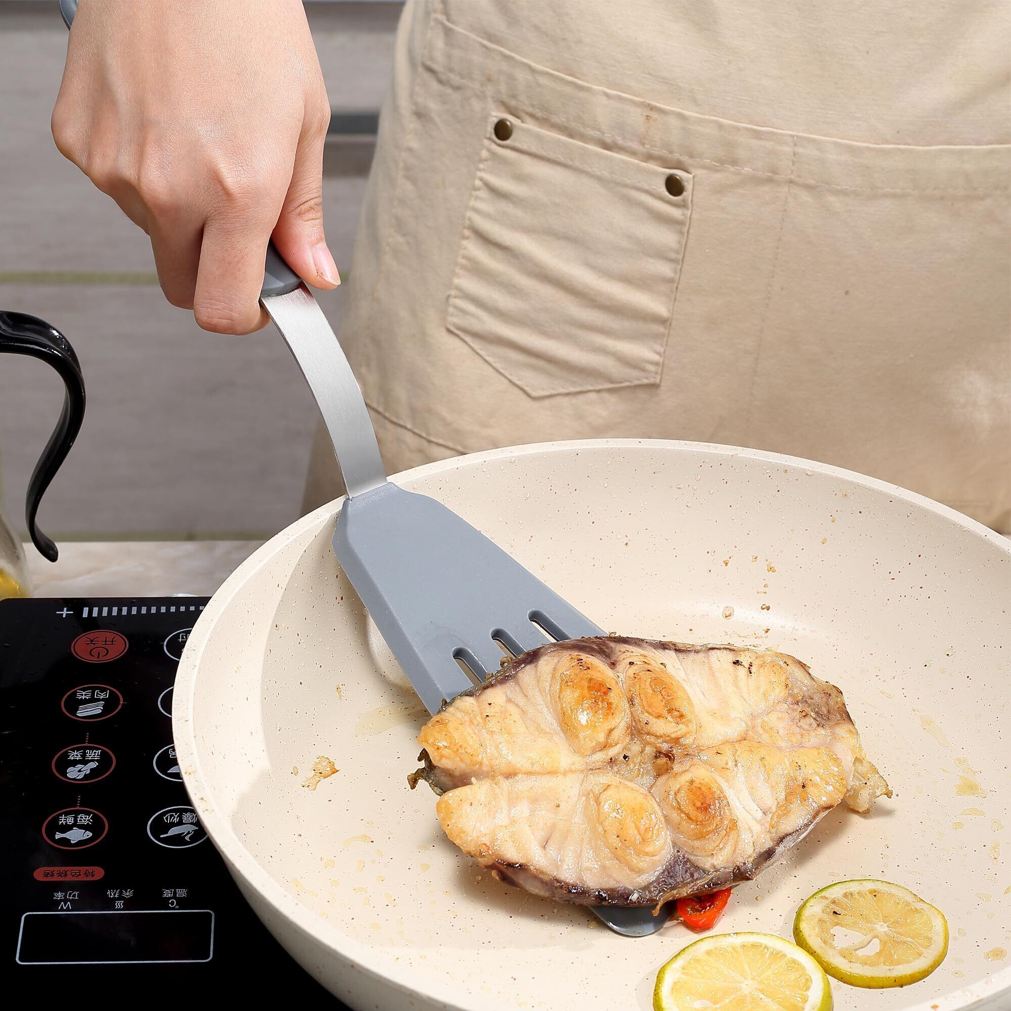 調理のさまざまなニーズに対応可能 ‐ この製品セットには、角度付きスパチュラ1本、シリコーン製魚用スパチュラ1本、大型ターナースパチュラ1本、スタンダードターナースパチュラ1本、シリコーン製穴なしパンケーキスパチュラ1本が含まれます。さまざまな調理に使える、実用的なキッチン用品です。