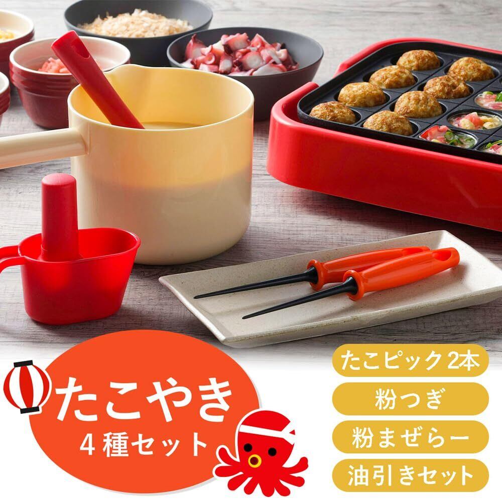 下村企販 たこ焼き 4種セット 【日本製・中国製】 たこ焼き便利グッズ 一式 たこ焼きピック 油引き 粉つぎ 泡立て 調理がスムーズに 本格的 パーティー 燕三条 41183