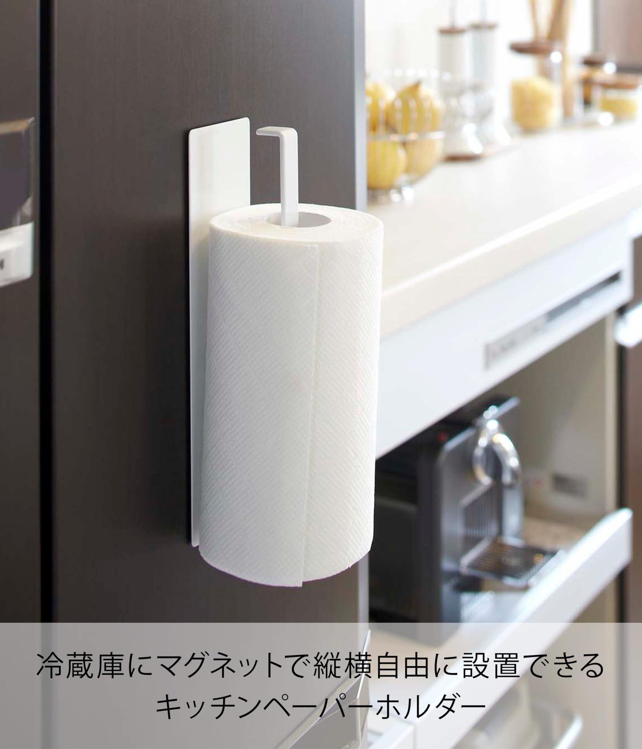 冷蔵庫横などにマグネットで簡単取り付けのキッチンペーパーホルダー。横向きに使えばタオルも掛けられます。