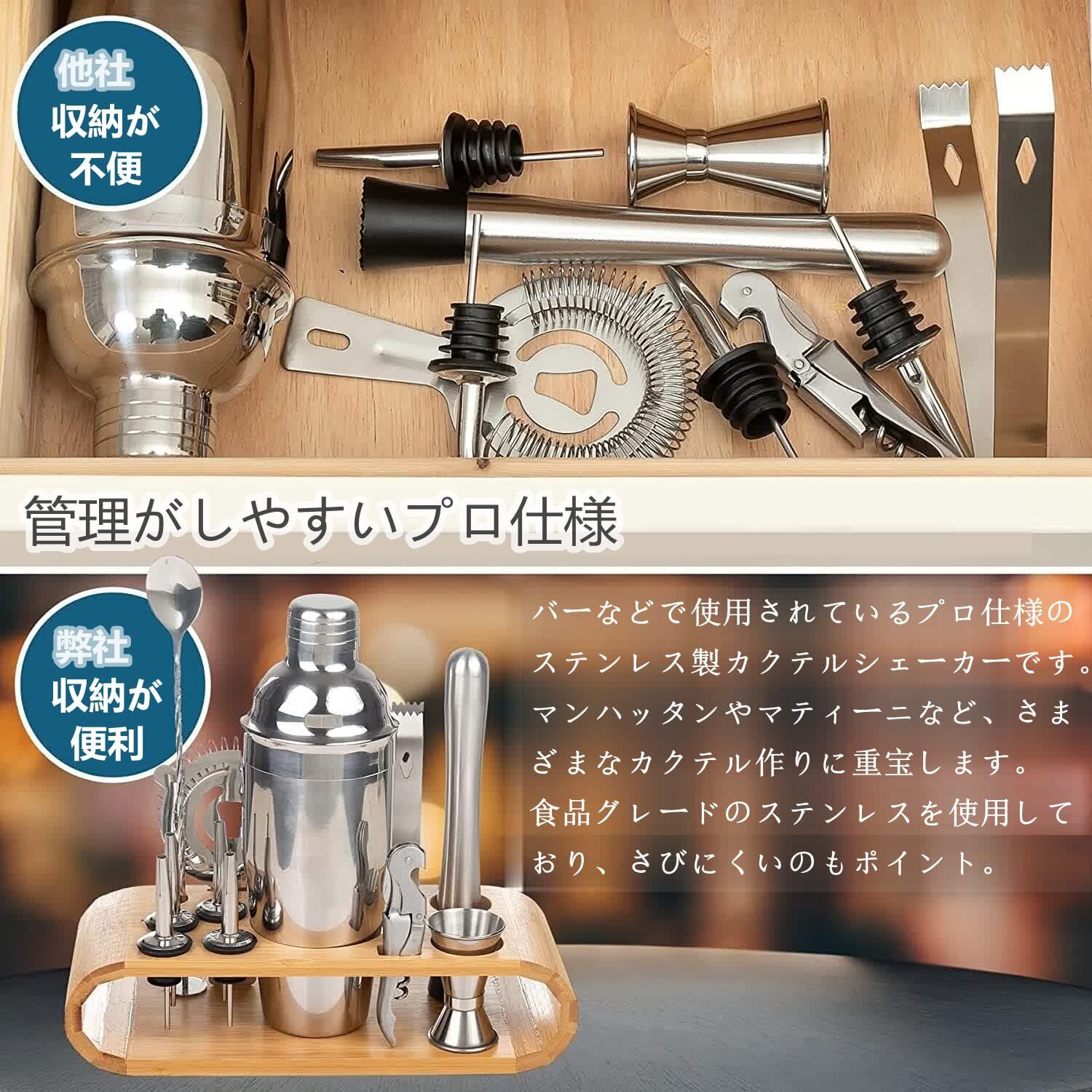 【カクテルシェーカーセット内容】:カクテルシェーカー550ml*1、バースプー*1、ブレンダー*1、ストレーナー*1、アイストング*1、ミキシングスプーン*2、ワインオープナー*1、ポアラー*4、スタンド*1。うまく設計された環境に優しい竹製ブラケットは、ツールバーツールを整然と整然と美しく保ちます。バーに行かず自宅でも美味しくて沢山のドリンクやカクテルを簡単に作れる完璧な12点バーセット。バーに行かず自宅でも美味しくて沢山のドリンクやカクテルを簡単に作れる完璧な12点バーセットで、初心者の方であれば、こちらのカクテルセットに入っているとおすすめと言えます。