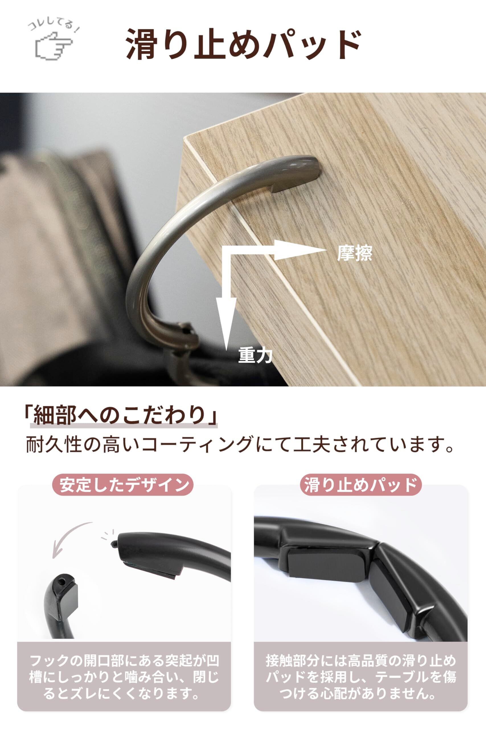 【滑り止めマット】フックの先端にはEVA滑り止めマットを使用して、滑りを防ぐだけでなく、日常的な使用や摩耗に対して強い耐性を持ち、家具を傷や損傷から守ることができます。あらゆるタイプのテーブル(厚さ7.2cmまで)に適応して、吊り下げることも可能です