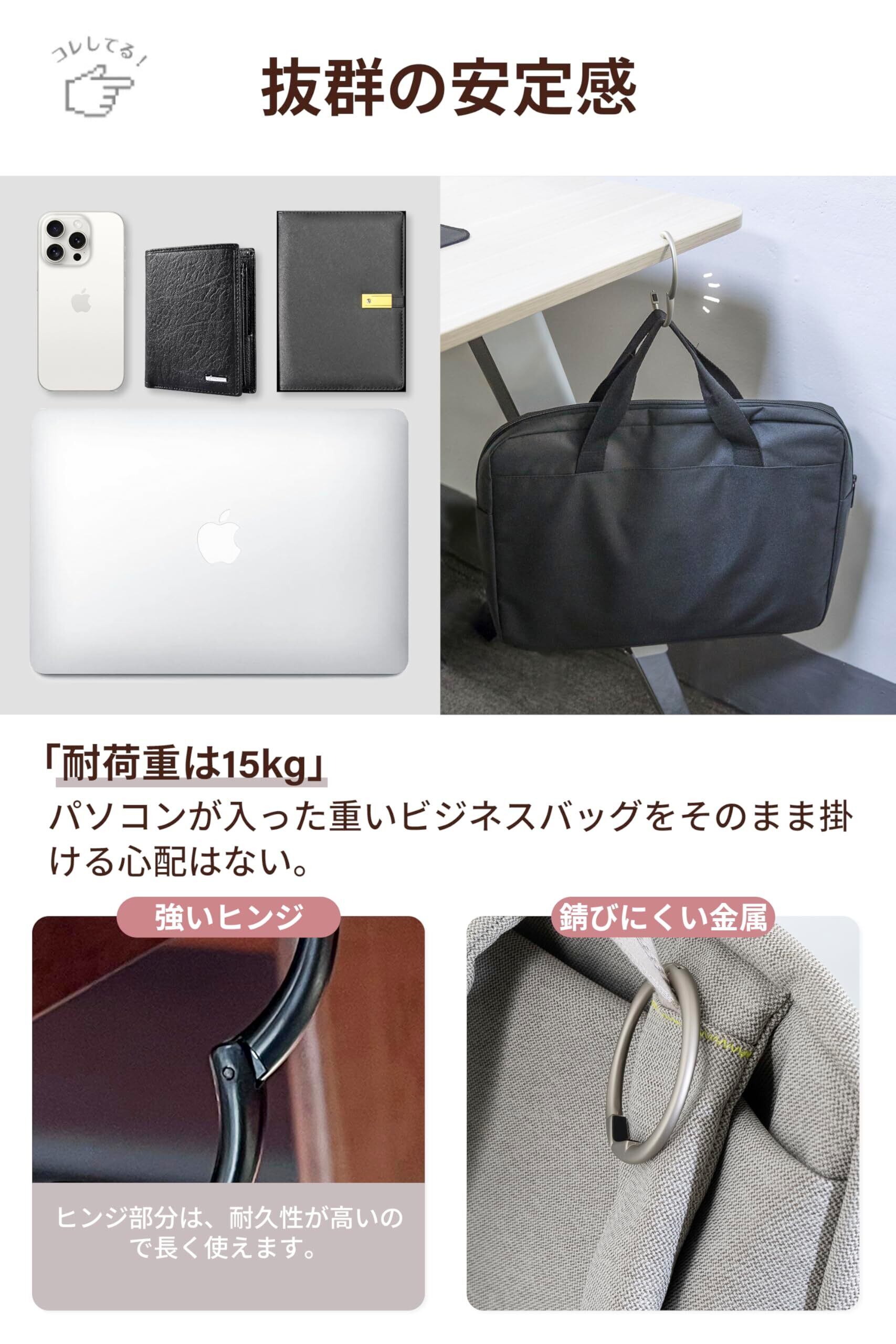 【耐久性UP・大耐荷重】重さ:38g、最大耐荷重:15kg。ハンドバッグはもちろん、大きな荷物まで掛けられるよう耐荷重はなんと15kgまで対応します。フックの内部構造は特殊で、1時間あたり2000回の開閉で40万回の繰り返しテストにもパスです