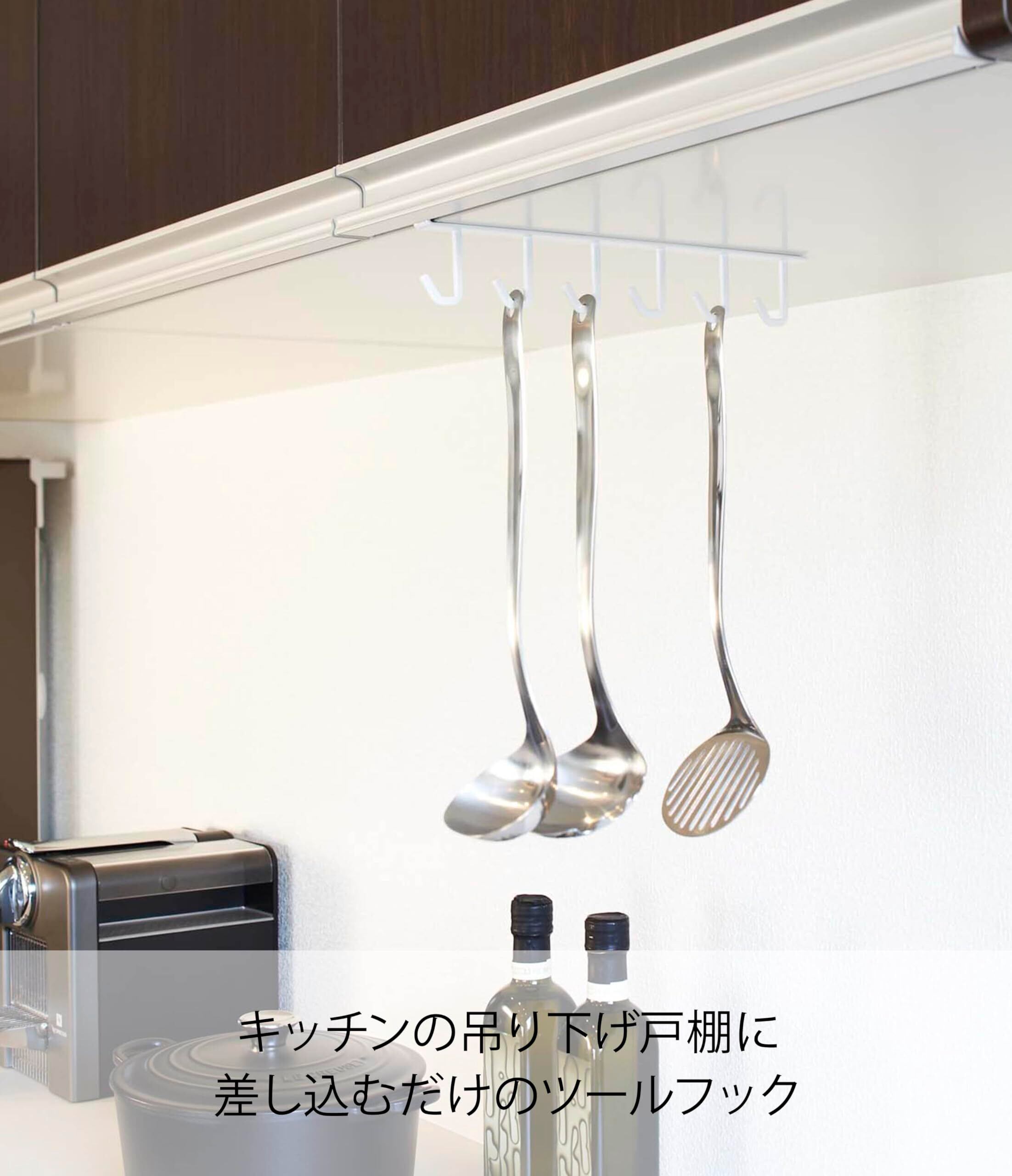 キッチンの吊り下げ戸棚に差し込むだけ! 調理中によく使うお玉やフライ返しなどのキッチンツールをサッと取り出せるのが便利。キッチン周りをスタイリッシュに演出するシンプルなデザイン。