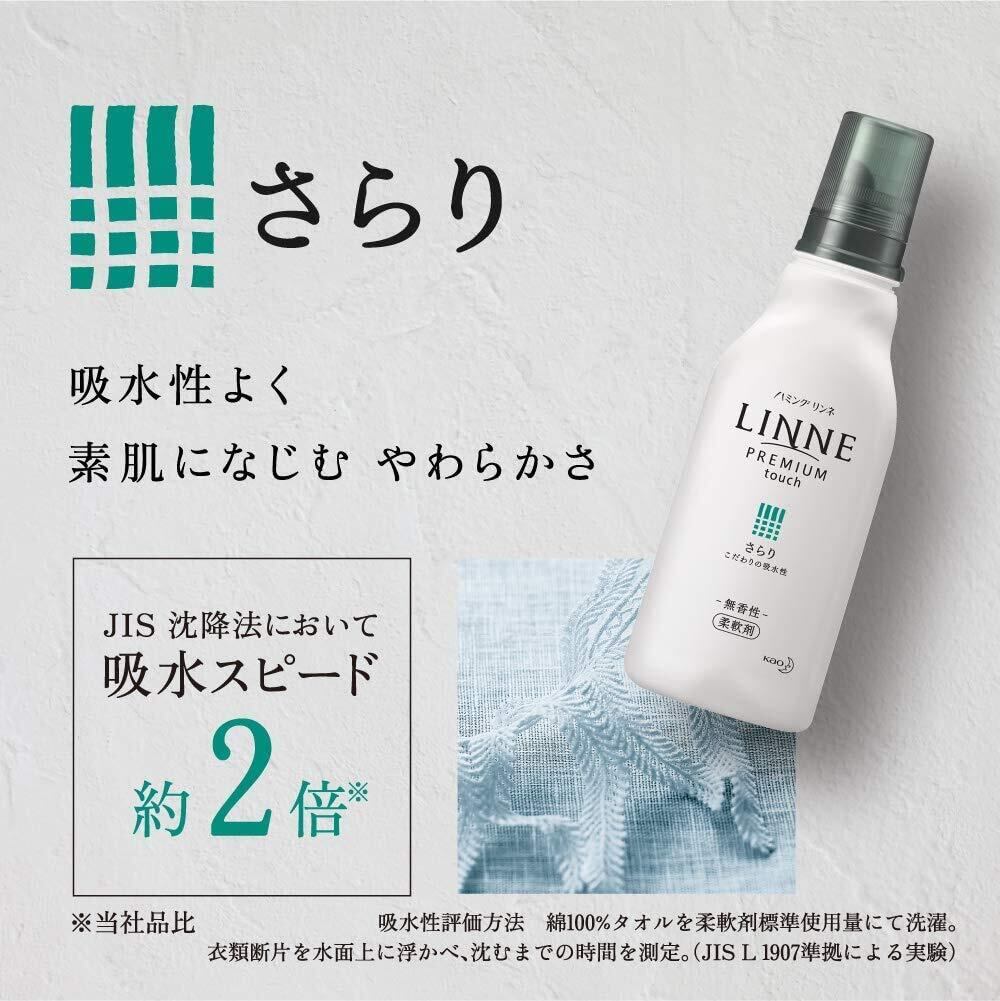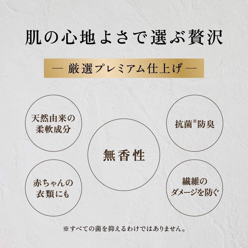 肌の心地よさで選ぶ贅沢。厳選プレミアム仕上げの柔軟剤。 柔軟剤の本質を追及した。やわらかさの先にあるこだわりの仕上がり。 吸水性にこだわった、さらりタイプ。 無香性。深呼吸したときに感じる洗濯したての素材の香り。