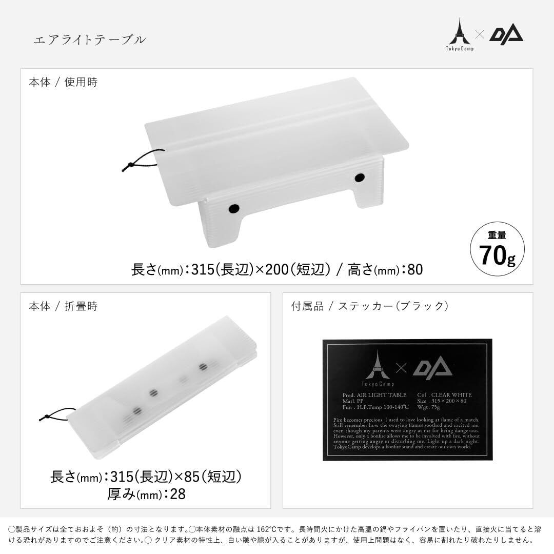 【エアライトテーブル】 TokyoCamp×OPTIONコラボ商品! OPTIONとは、キャンプギアに「選択」を与え、新たな価値を生み出すこと。韓国発のキャンプスタイルを提案するブランドとのコラボ商品の登場です。 超軽量!コンパクト。ソロキャンプ、ハイカー、バックパッカーのためのソロテーブル 重さを感じさせないエアリーなクリアホワイトカラーでどこへでも連れ出せる相棒と一緒に今日はどこへ行こうか。