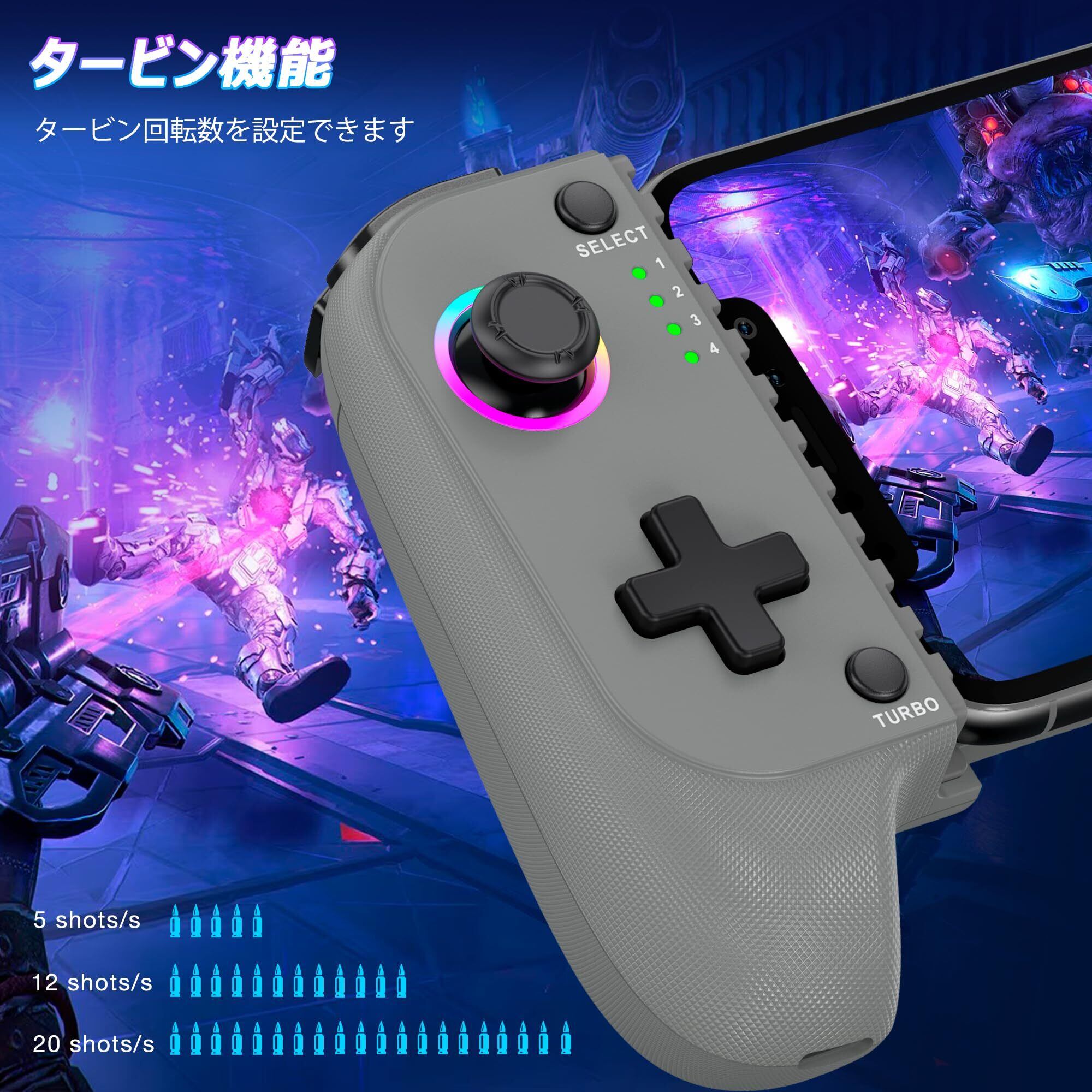 【彩り豊かなRGBライティング】Gametoureのモバイルコントローラーは、タクタイルなボタンにRGBライティングを搭載しており、暗い場所でも視認性を高めます。Turbo+R3:ジョイスティックRGB調整。Turbo+L3:ABXYボタンのRGB調整。