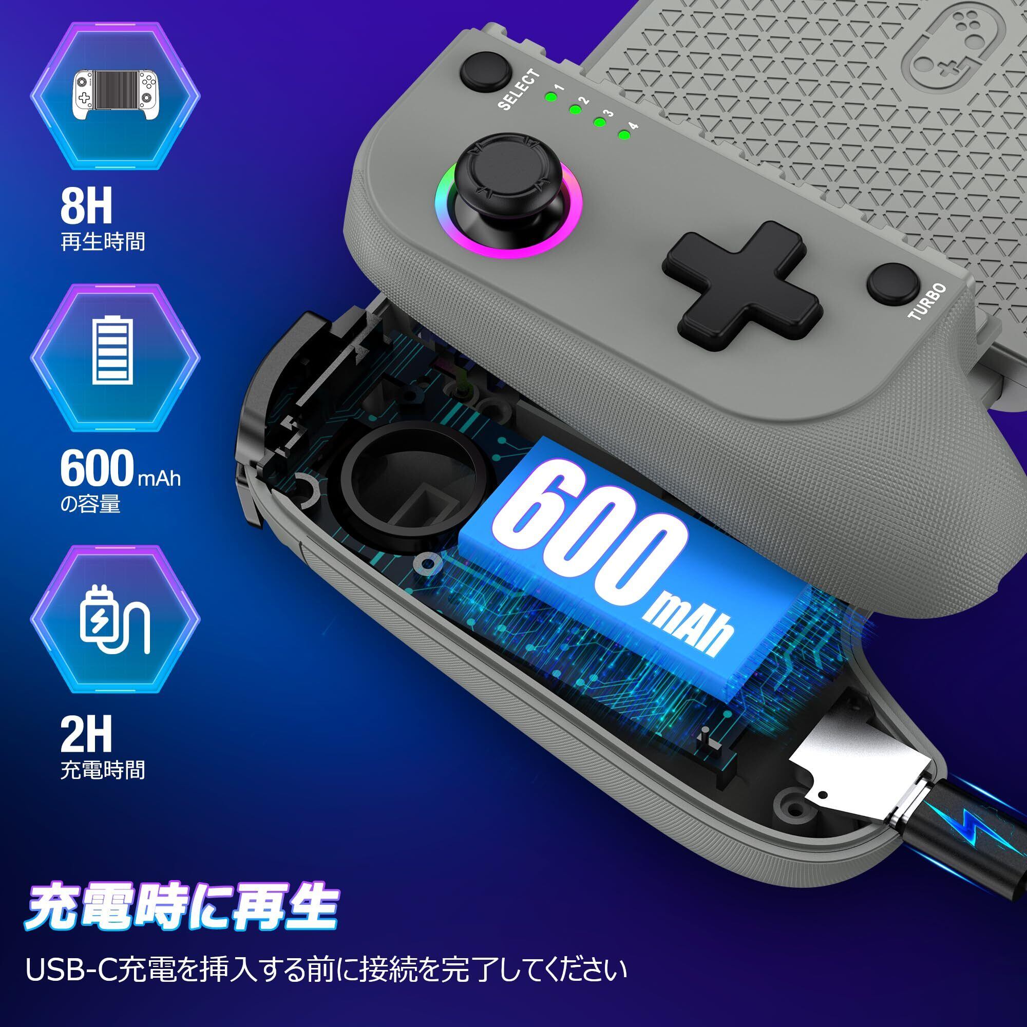 【長時間プレイ可能】GametoureのiPhone/Androidコントローラーは、600mAhの大容量充電池を搭載しており、充電に2〜3時間かかり、20時間以上プレイできます。ただし、コントローラーを充電している間は、同時にスマートフォンを充電できません。途切れることなくプレイするために、コントローラーを使用する前にスマホを充電することをお勧めします。