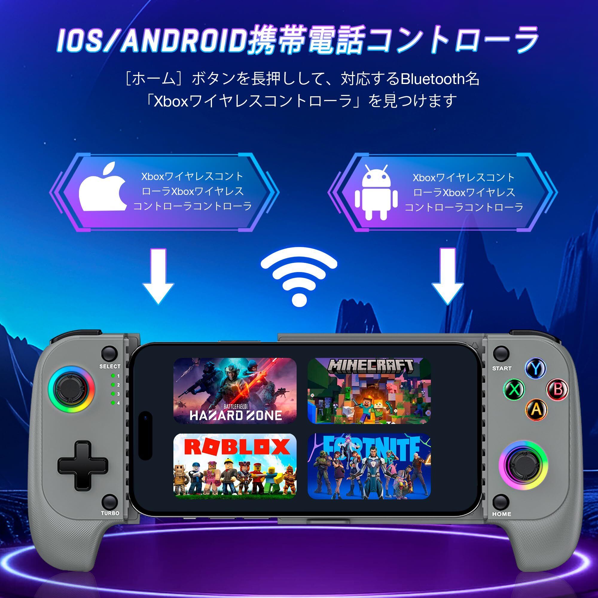【モバイルゲーム専用コントローラー】任意のコントローラー対応ゲームをシームレスにプレイ可能。Xbox Game Pass、Playstation Remote Play、Steam Link、GeForce NOW、MFi Apple Arcade、Google Stadia、Rainwayなど、クラウド型ゲーミングサービスにも対応。また、Fortnite、Minecraft、Roblox、Genshin Impact、Among Us、Brawlhalla、Asphalt 9: Legends、Cyberpunk 2077、Destiny 2、Gear 5、Halo Collectionなどの人気モバイルゲームにも対応。