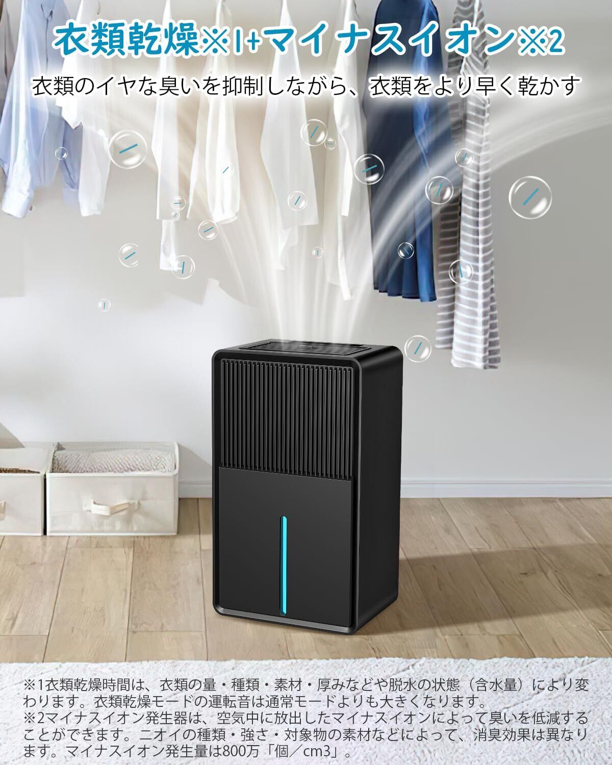 【衣類乾燥&空気浄化】小型化・省エネ化に加え、衣類乾燥が必要な場合は、湿気の多い時期用の乾燥モードを選ぶことで、衣類から余分な湿気を取り除き、カラッと清潔に保つことができます。 これは普通の除湿機にはない機能だ。また、梅雨の時期は生乾きの衣類が臭くなりがちなので、除湿機には空気を浄化して臭いを軽減するマイナスイオン機能も搭載しています。マイナスイオン発生装置は、空気中にマイナスイオンを放出することで、ニオイを軽減することができます。