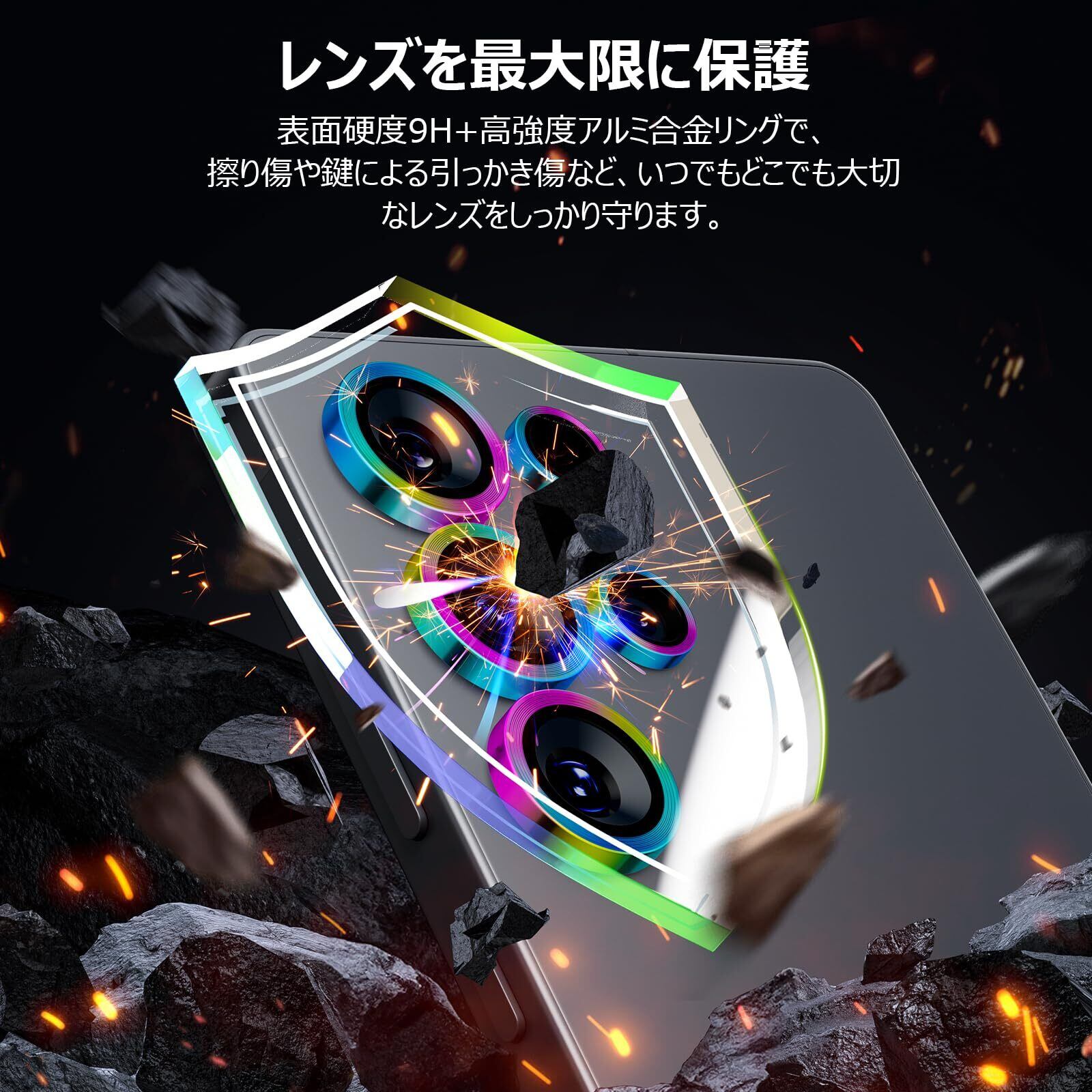 【圧倒的な防御・超耐衝撃】硬度9Hの強化ガラスを採用し、擦り傷や衝撃からレンズ表面をしっかり守ります。さらに、縁部分には軽量かつ高強度なアルミ合金フレームを使用することで、落下時の衝撃を吸収し、レンズ周囲まで広範囲に保護します。細部までこだわった構造で、カメラの美しさと機能性を損なうことなく、大切なカメラレンズを強力にガードします。